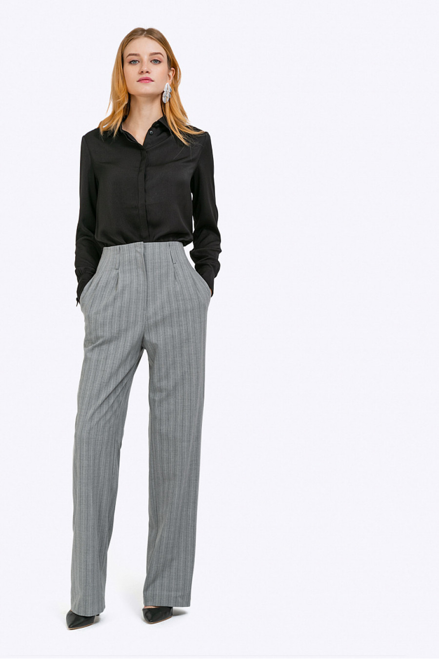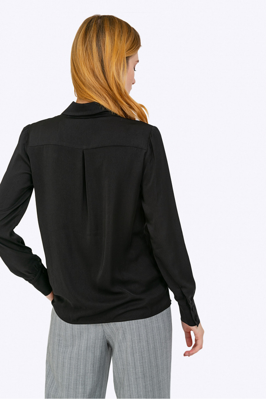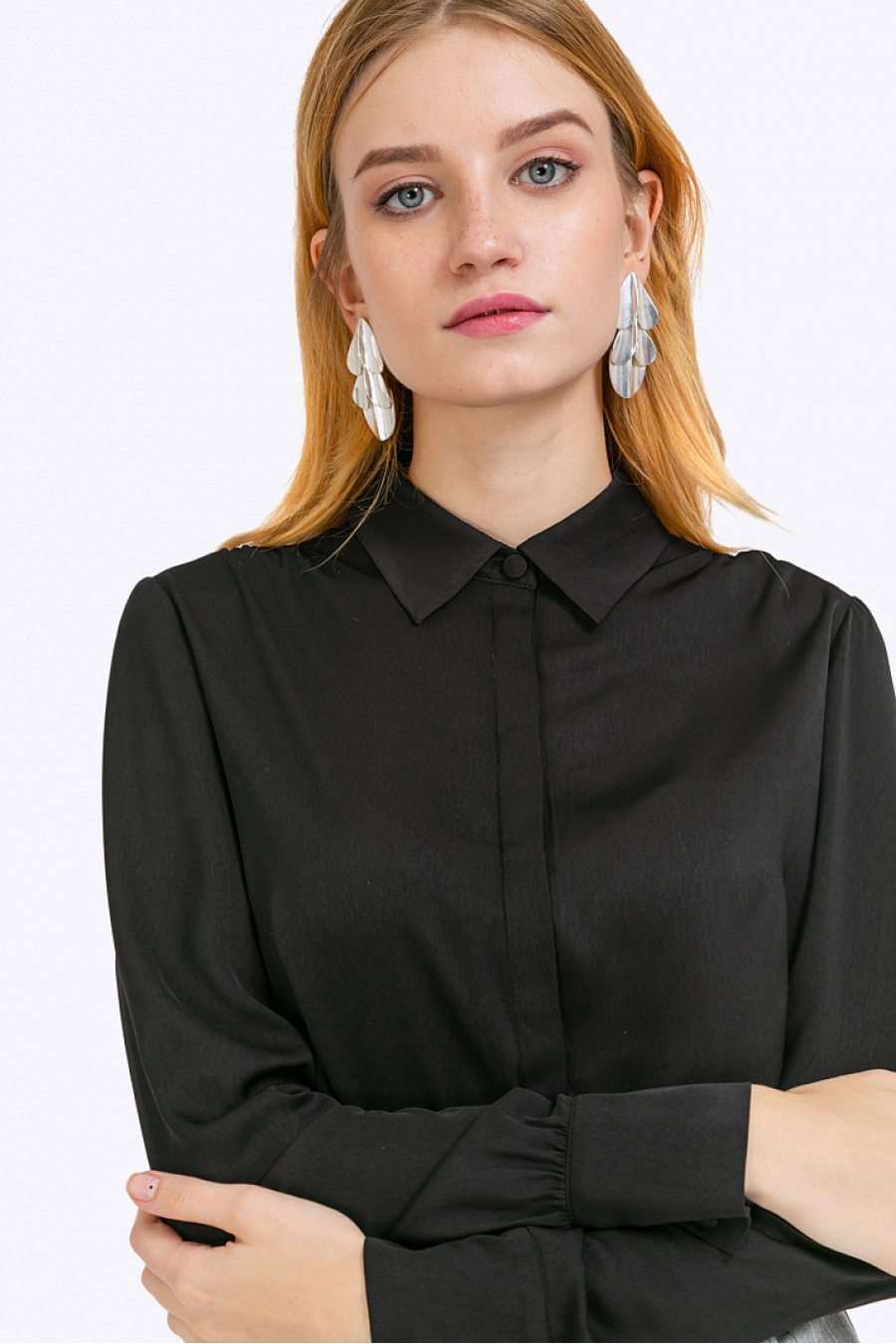 Блузка из струящейся поливискозы. Модель прямого кроя, свободно облегает фигуру. Блузка имеет отложной воротник, закрытую застежку-планку спереди, длинные рукава, дополненные широкими манжетами с обтянутыми тканью пуговичками. Рост фотомодели 177 см.