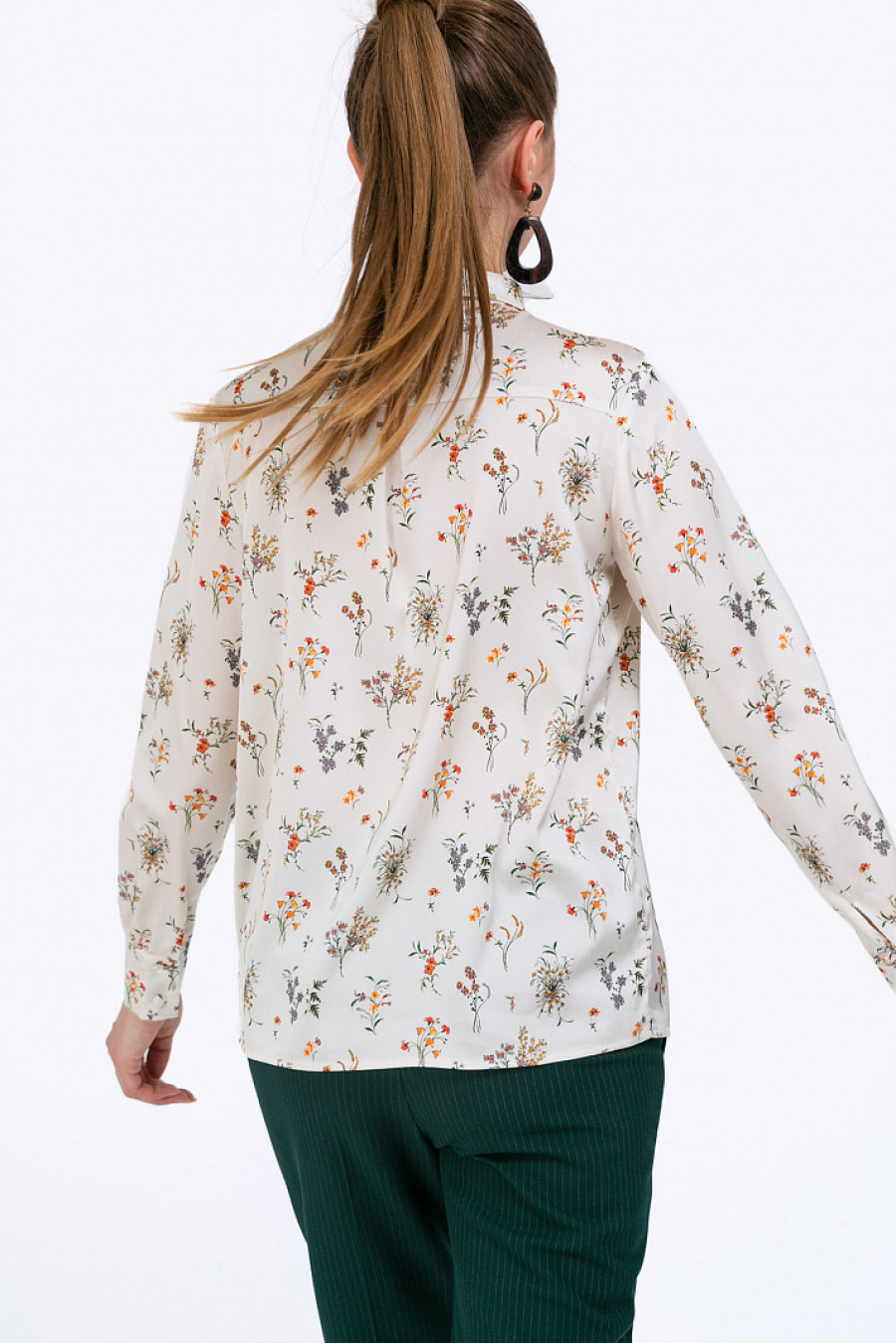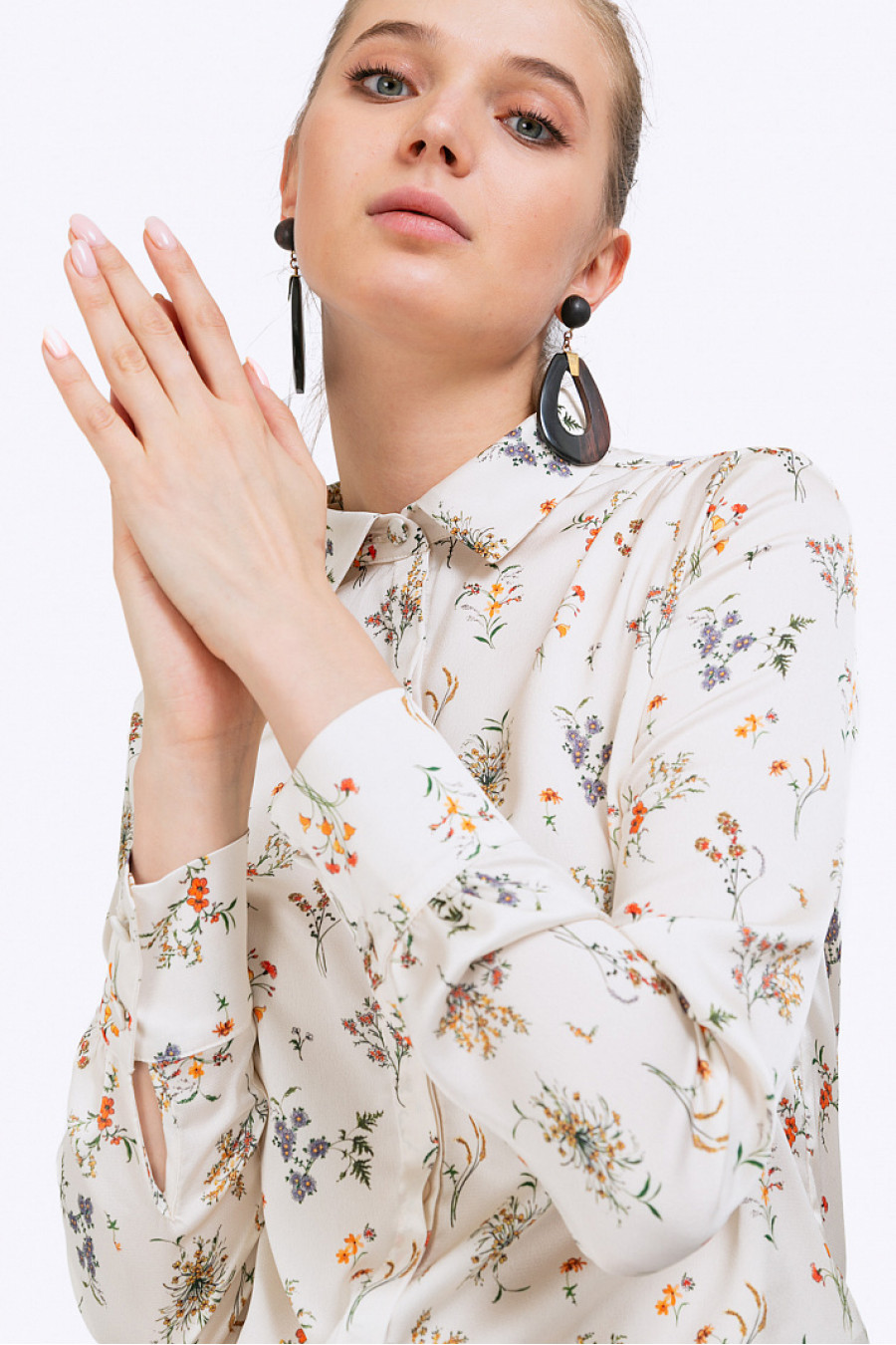 Блузка из струящейся поливискозы. Модель прямого кроя, свободно облегает фигуру. Блузка имеет отложной воротник, закрытую застежку-планку спереди, длинные рукава, дополненные широкими манжетами с обтянутыми тканью пуговичками. Рост фотомодели 177 см.