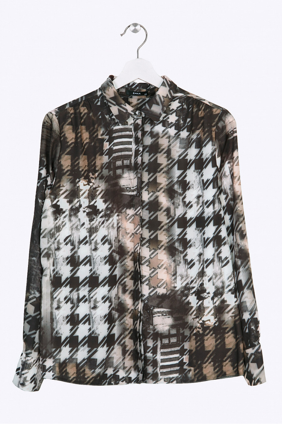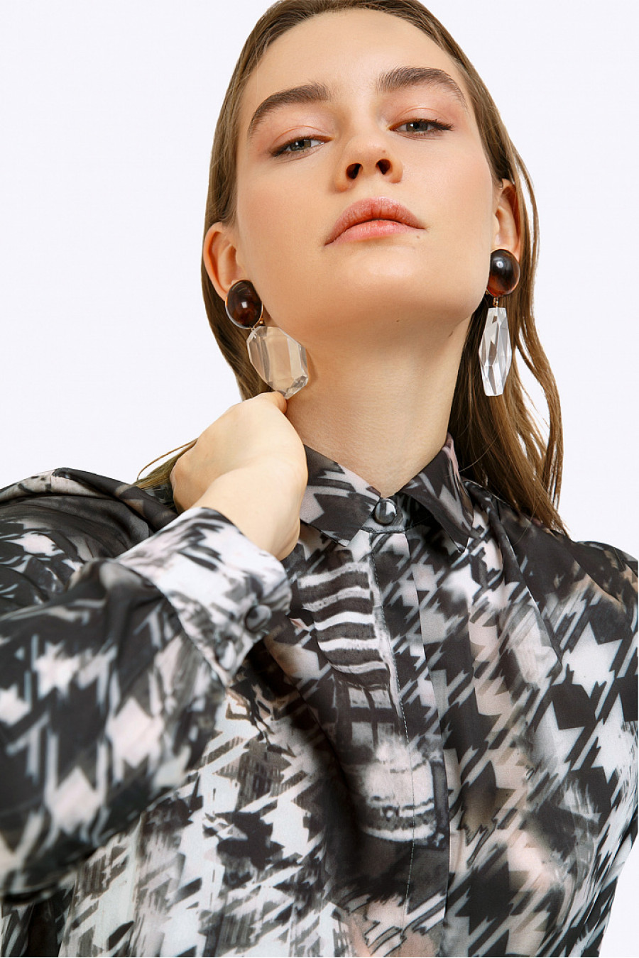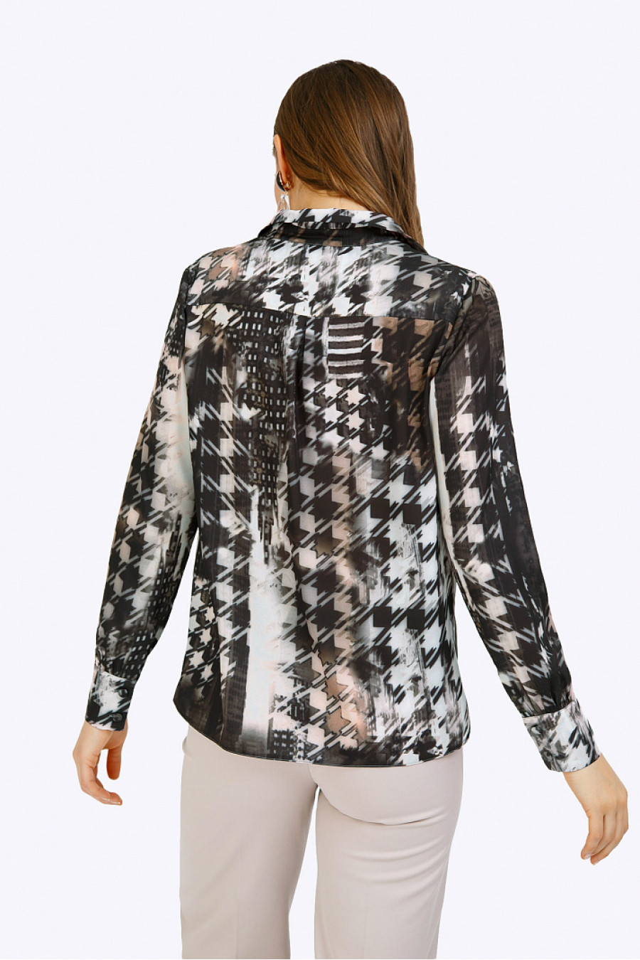 Блузка из струящейся поливискозы. Модель прямого кроя, свободно облегает фигуру. Блузка имеет отложной воротник, закрытую застежку-планку спереди, длинные рукава, дополненные широкими манжетами с обтянутыми тканью пуговичками. Рост фотомодели 177 см.