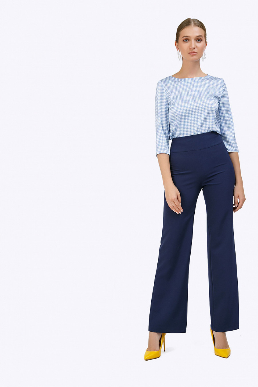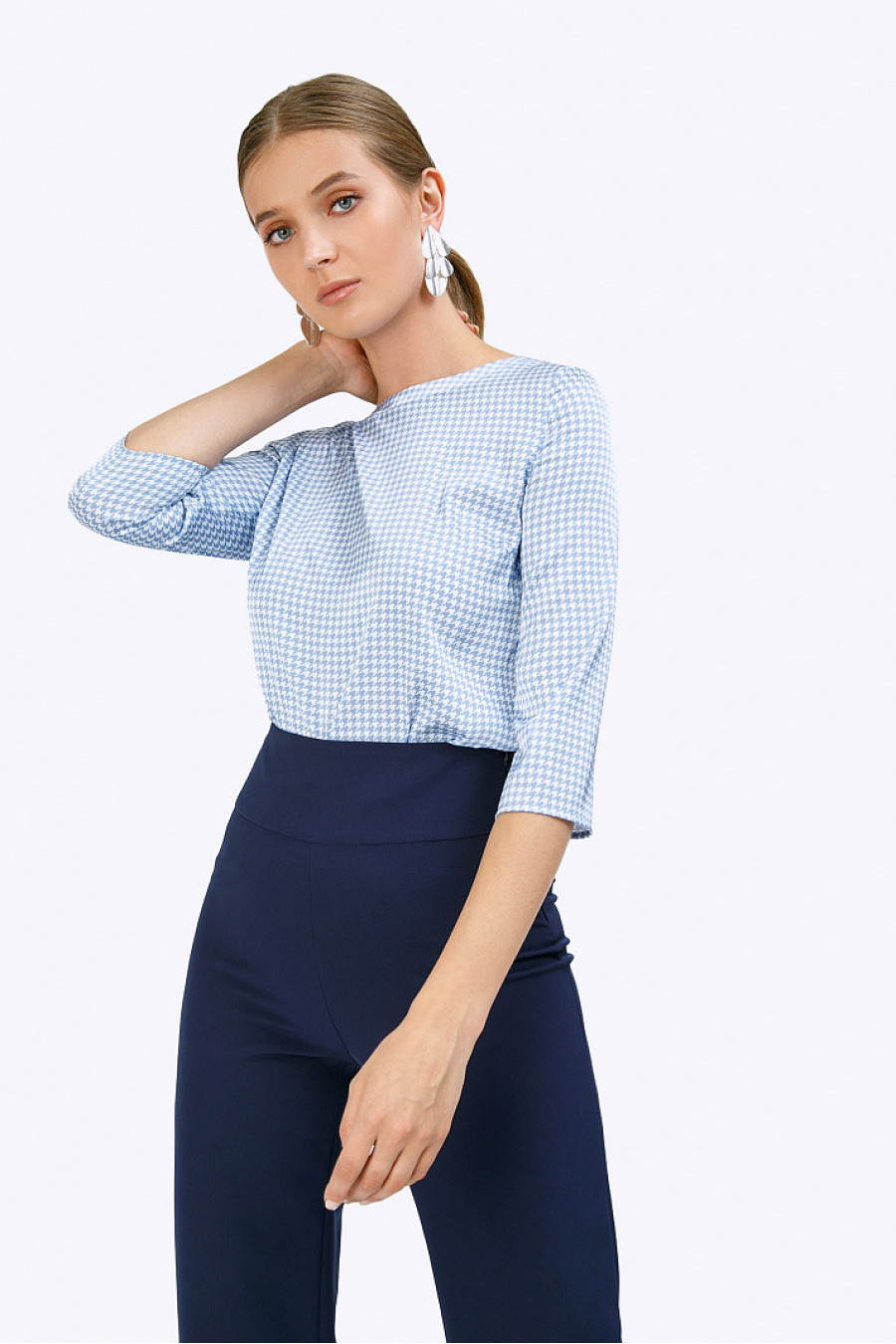 Блузка с рукавами ¾. Модель прямого кроя. Круглый вырез горловины обработан широкой бейкой. Имеются небольшие разрезы в боковых швах.