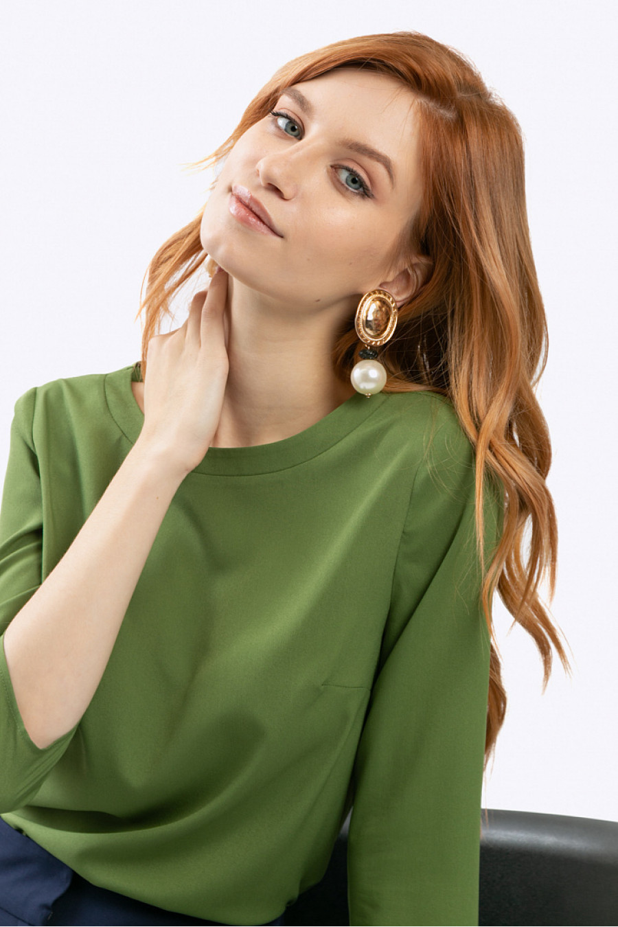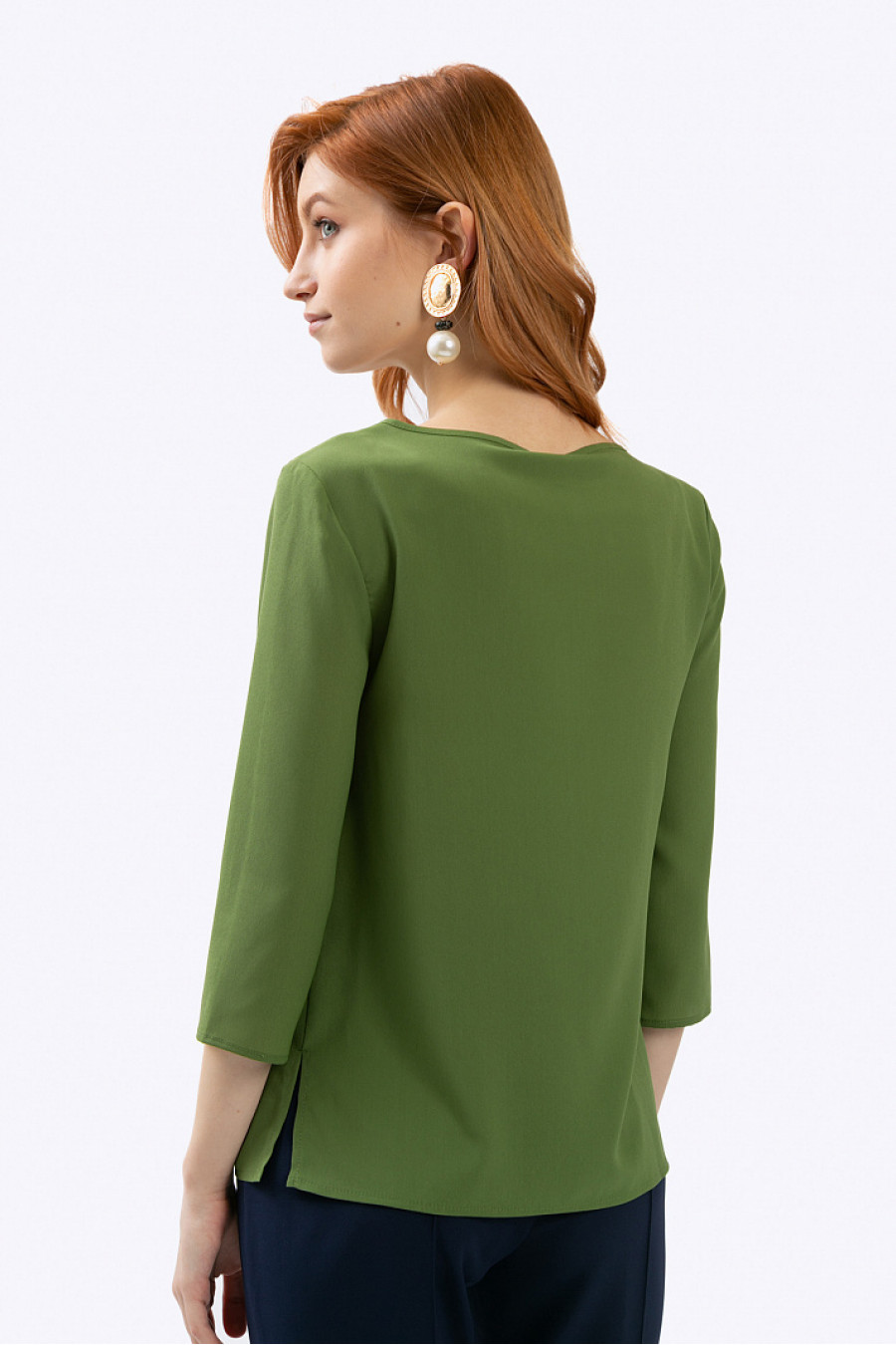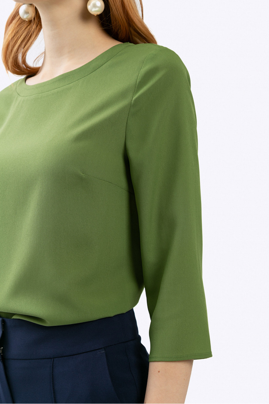 Блузка с рукавами ¾. Модель прямого кроя. Круглый вырез горловины обработан широкой бейкой. Имеются небольшие разрезы в боковых швах.