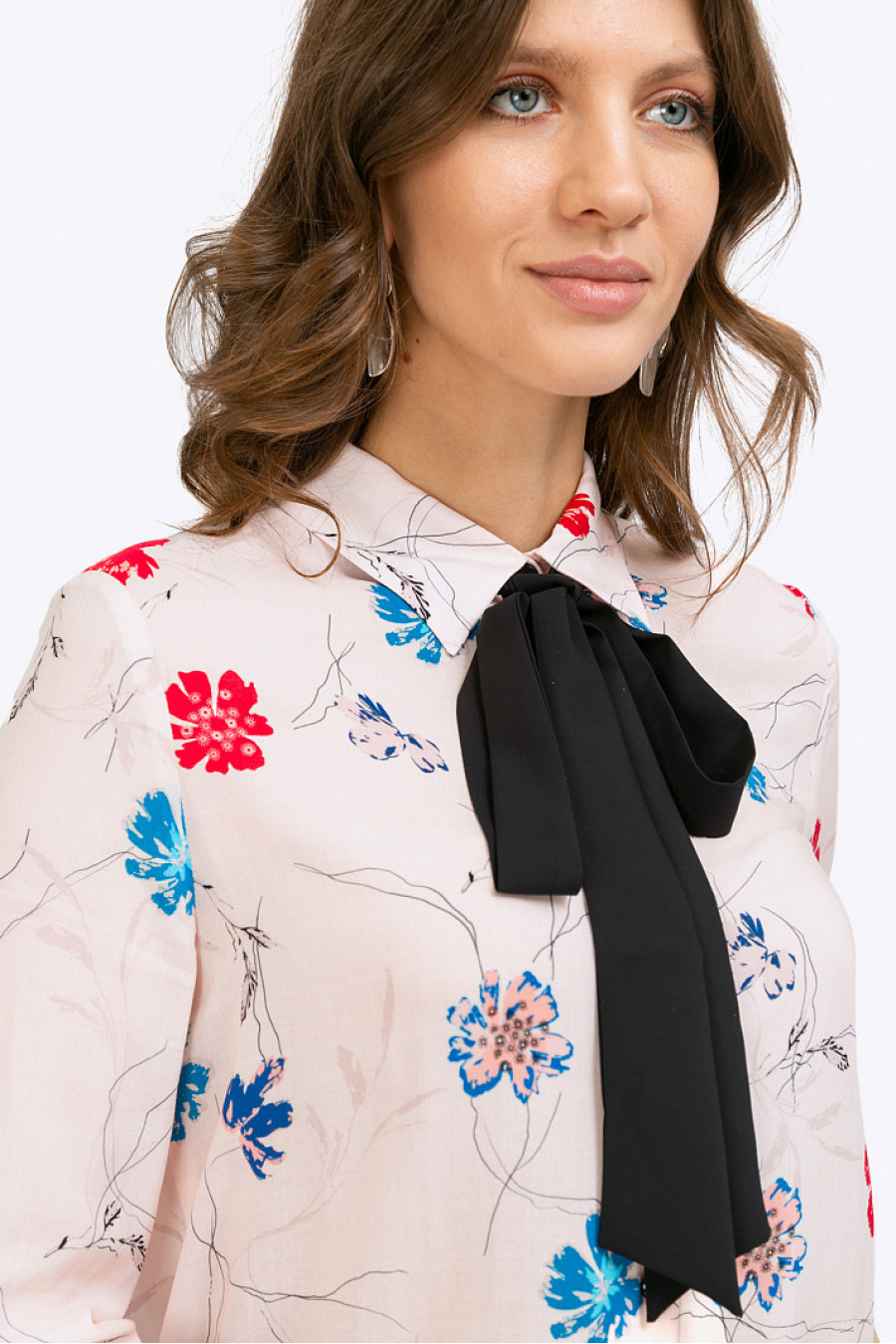 Блузка прямого крояс цветочным орнаментом и контрастным чёрным бантом. Модель для образов в романтическом стиле. Имеет отложной воротник,спереди планку на пуговицах, фигурную линию подола с разрезами в боковыхшвах.Рукава ¾ дополнены манжетами. Бант снимается.