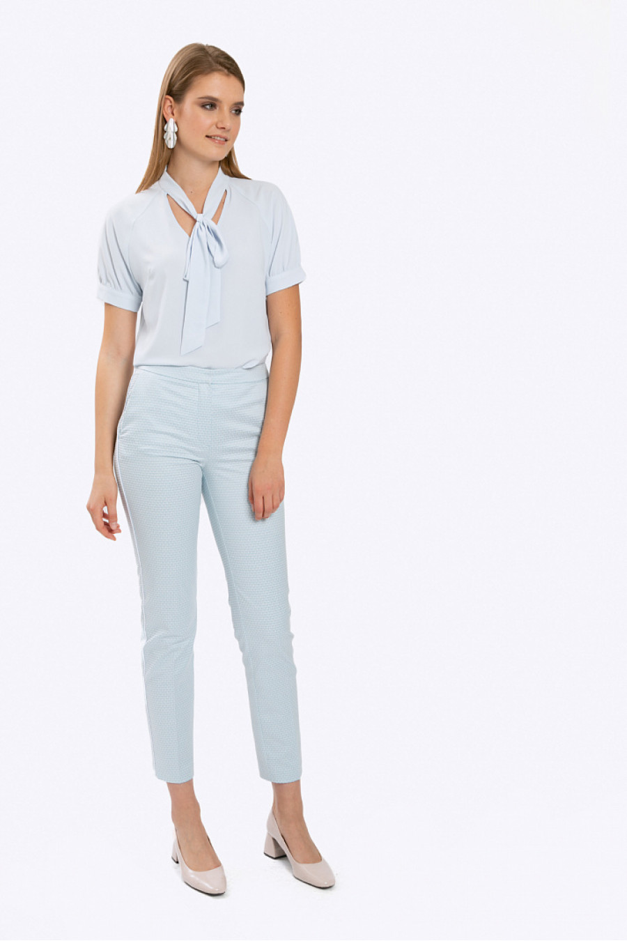 Блузка небесно-голубого оттенка с воротником «аскот».Модель прямого кроя. Имеет короткийрукав-реглан,дополненныйманжетами. Центром композиционного решения является воротник, который можно завязывать в виде банта, галстука, либо цветка.