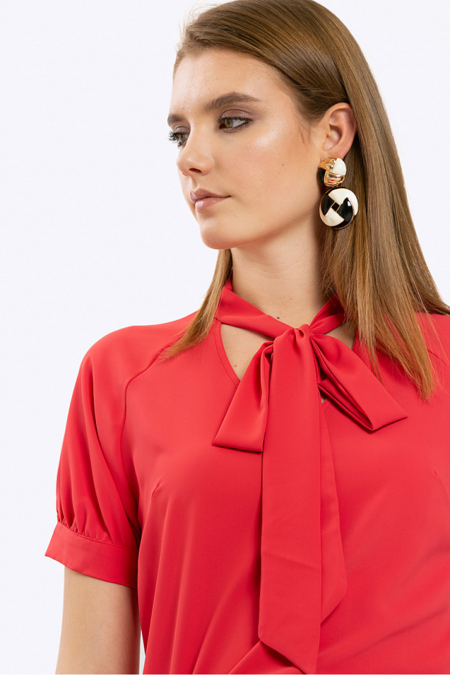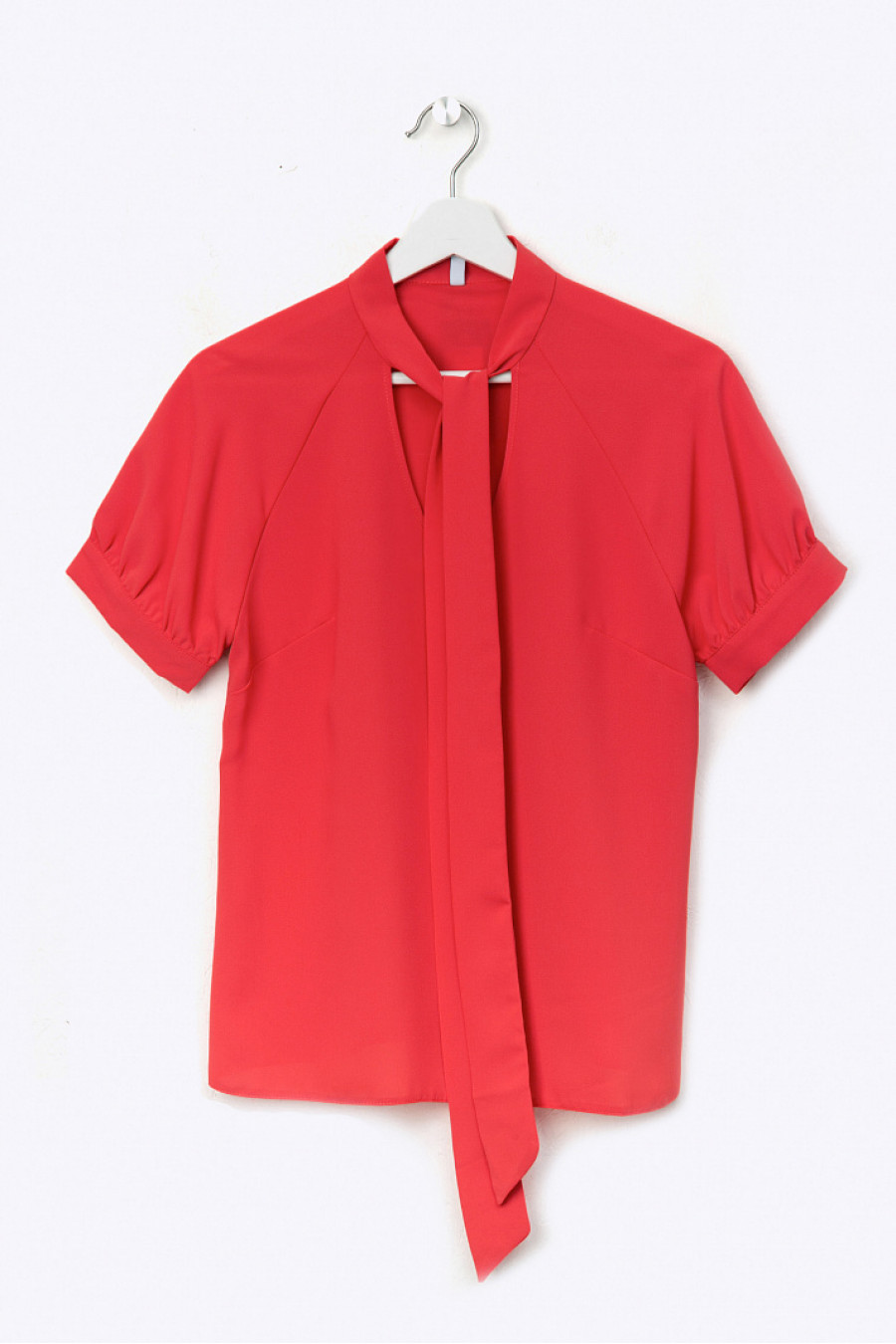 Яркая блузка красного цвета с воротником «аскот».Модель прямого кроя. Имеет короткий рукав-реглан,дополненный манжетами. Центром композиционного решения является воротник, который можно завязывать в виде банта, галстука, либо цветка.
