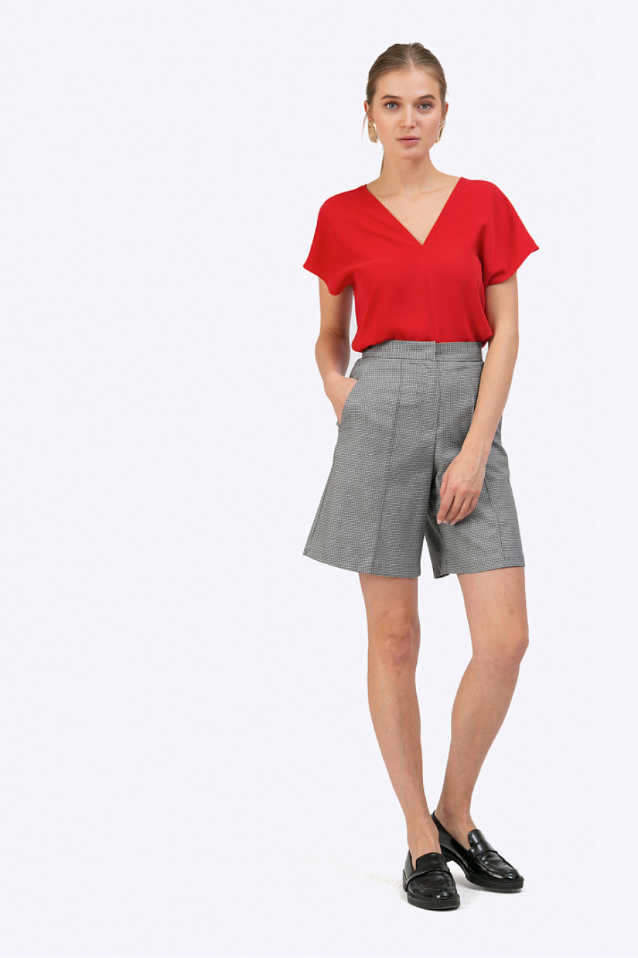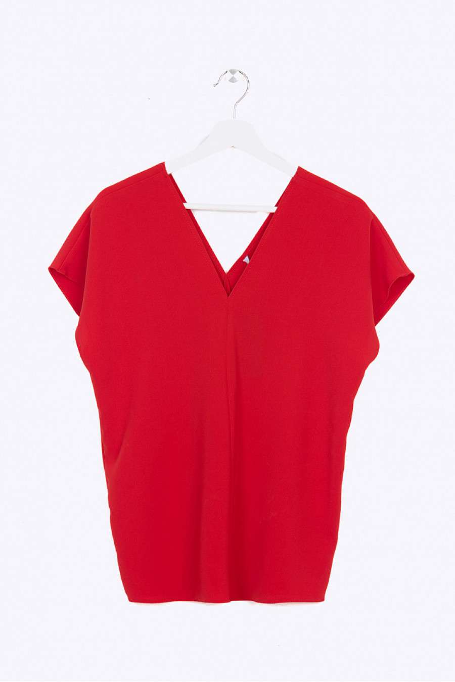 Краснаяблузка прямого кроя. Модель имеет V-образный вырез спереди и на спинке, цельнокроеные короткие рукава, средний шов. Рост фотомодели 177 см.