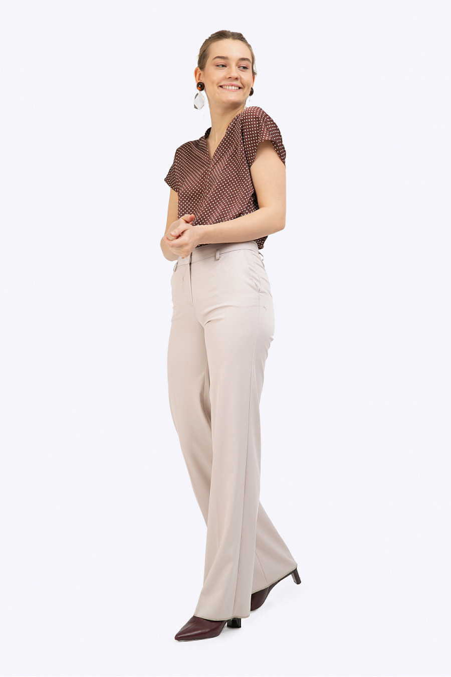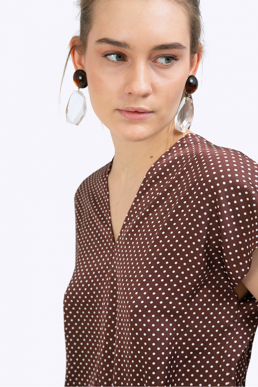 Коричневая блузка в горох.Модель прямого кроя,имеет V-образный вырез спереди и на спинке, цельнокроеные короткие рукава, средний шов. Рост фотомодели 177 см.