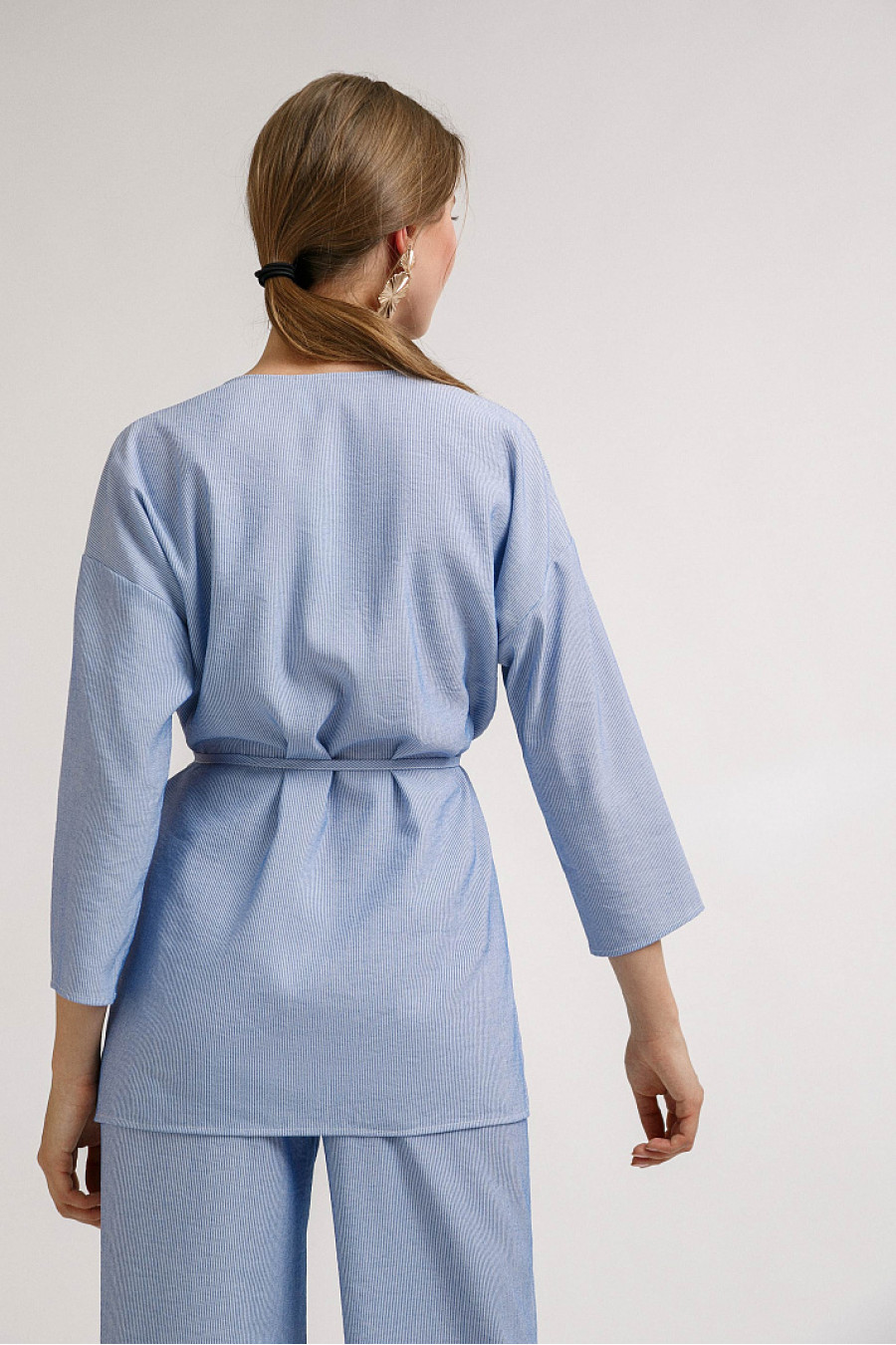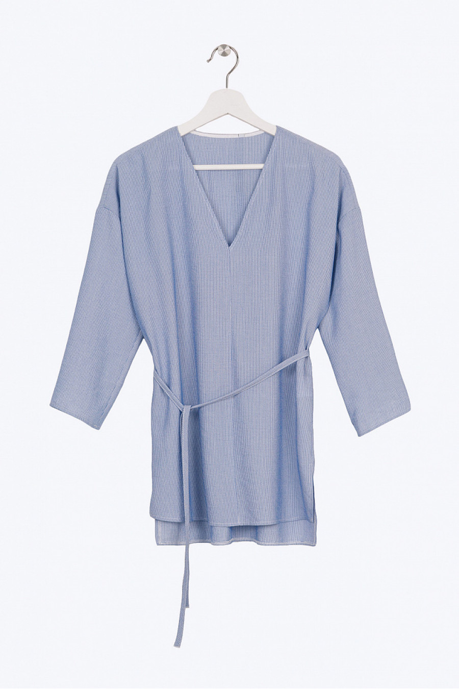 Синяя блузка в полоску. Приталенная модель, имеет V-образный вырез горловины, рукава 3/4 с заниженной проймой, разрезы по бокам и асимметричный низ. Линия талии подчеркнута тонким поясом.