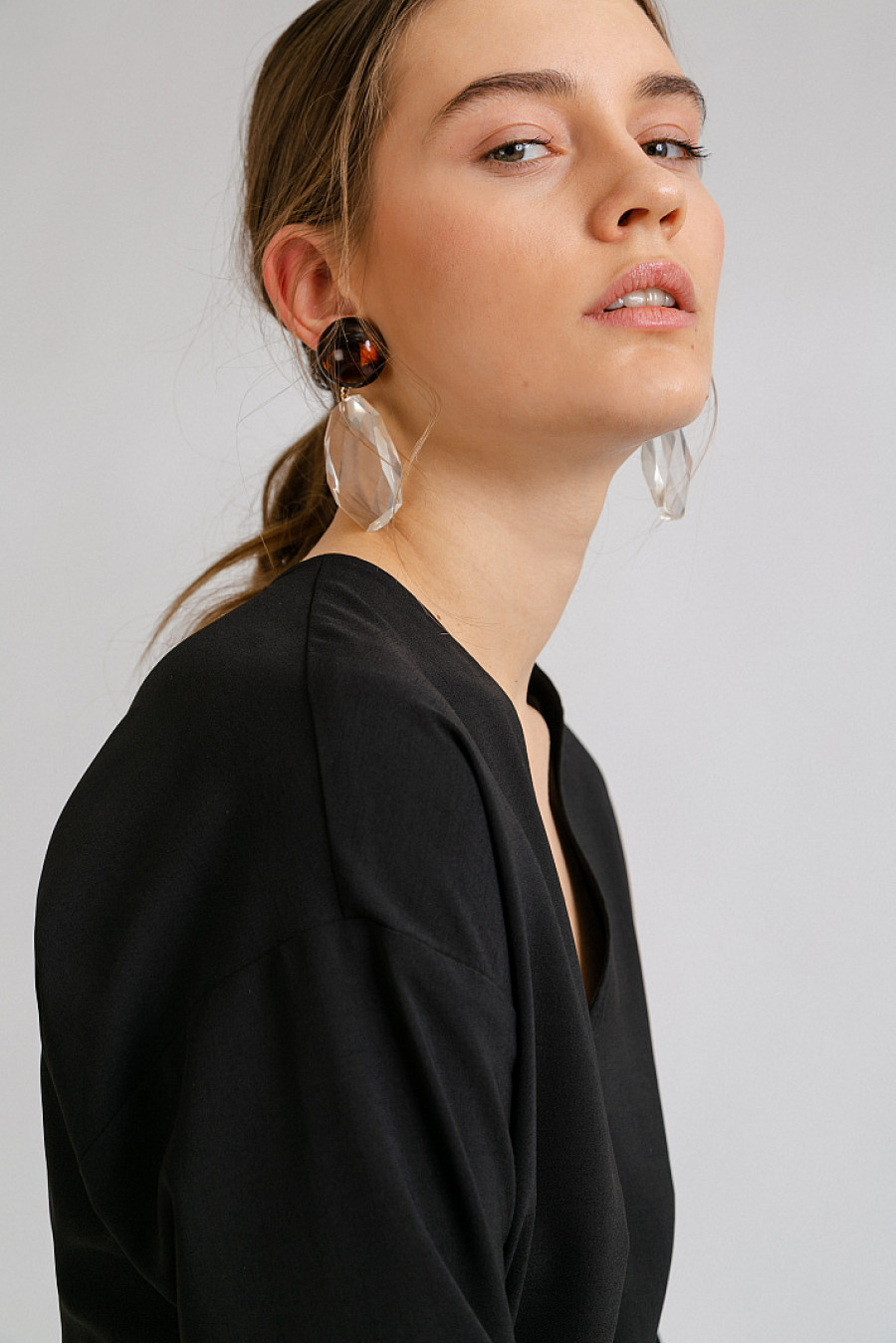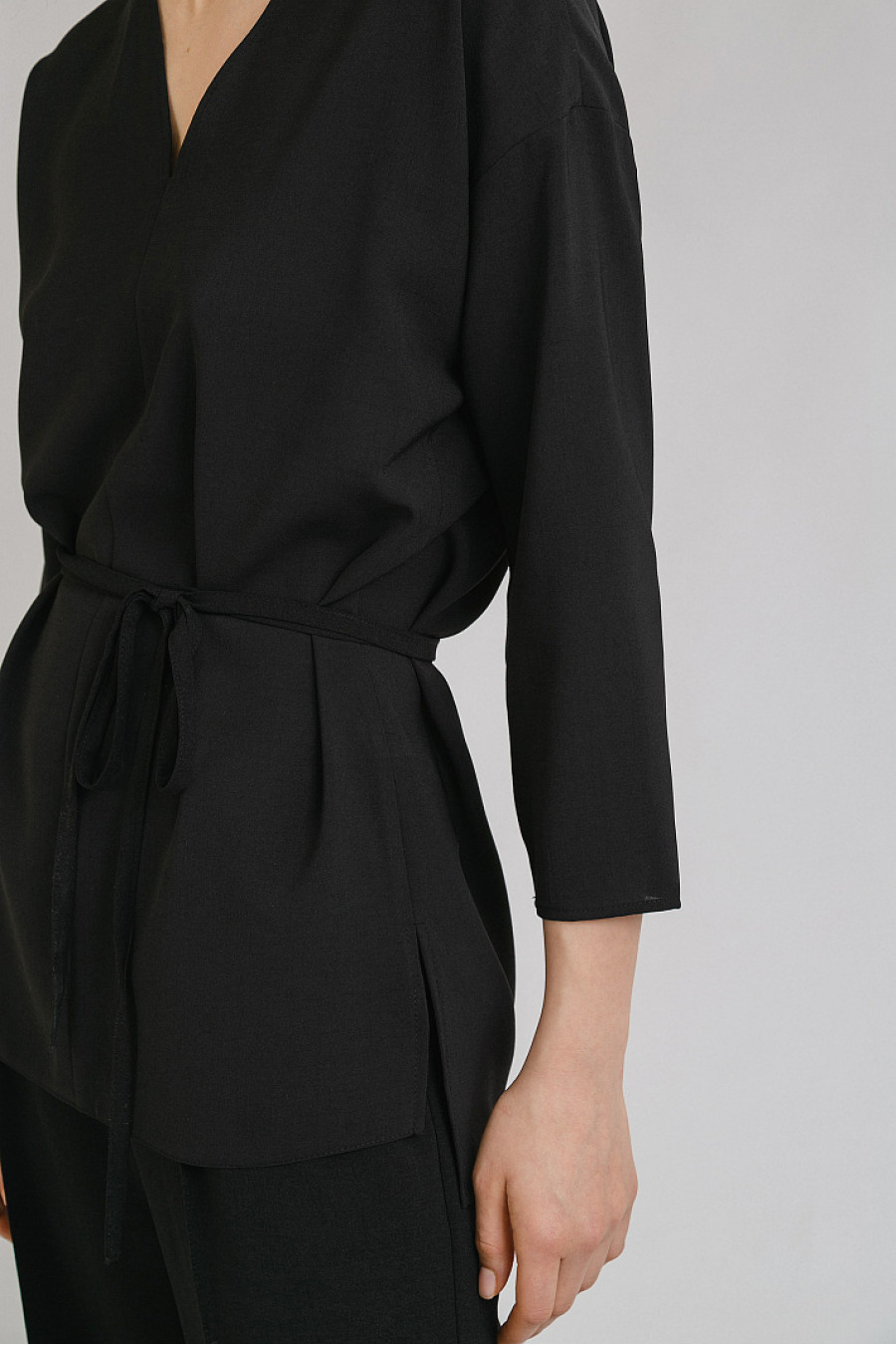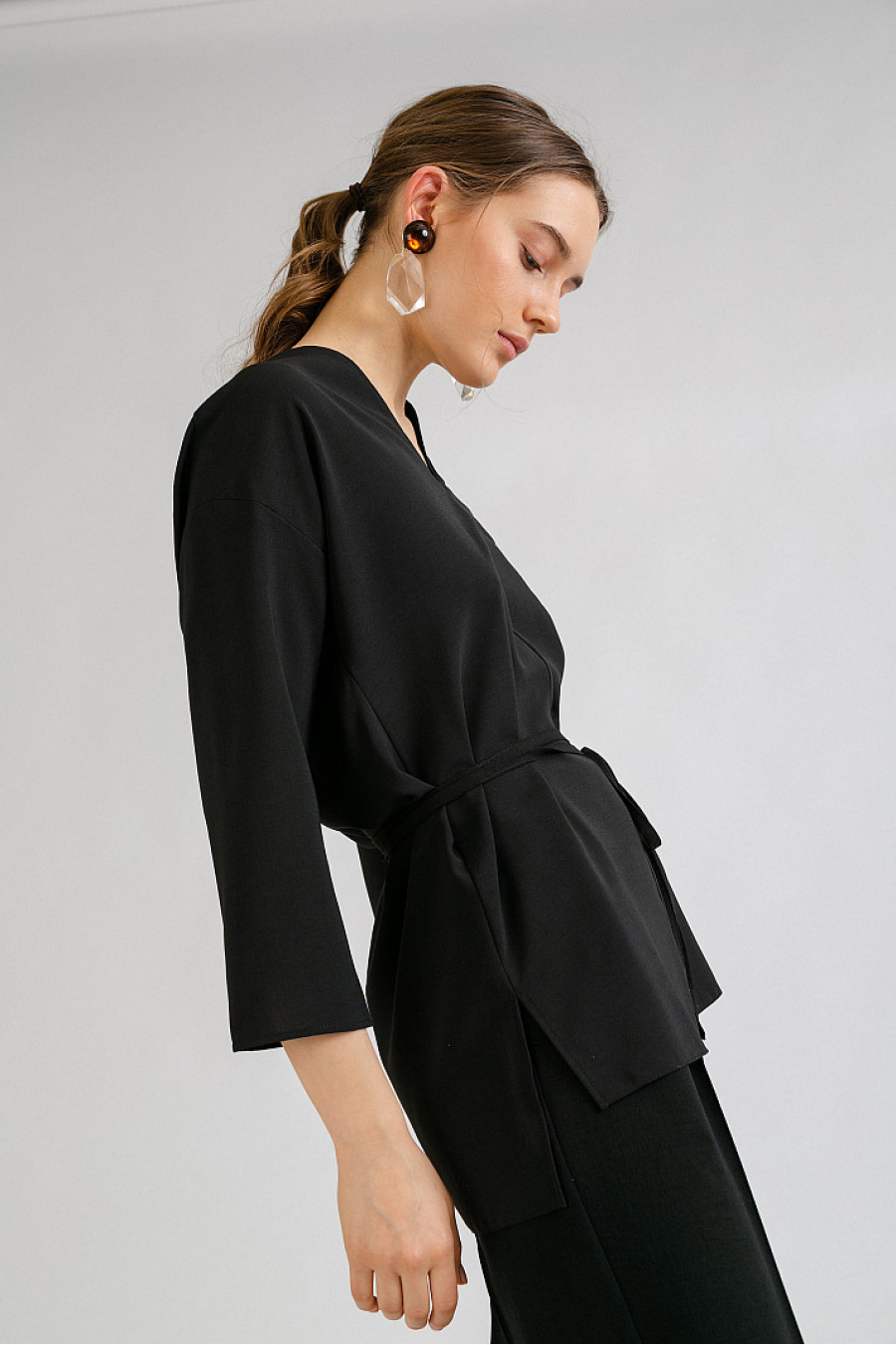 Базовая чёрная блузка из легкой ткани. Приталенная модель, имеет V-