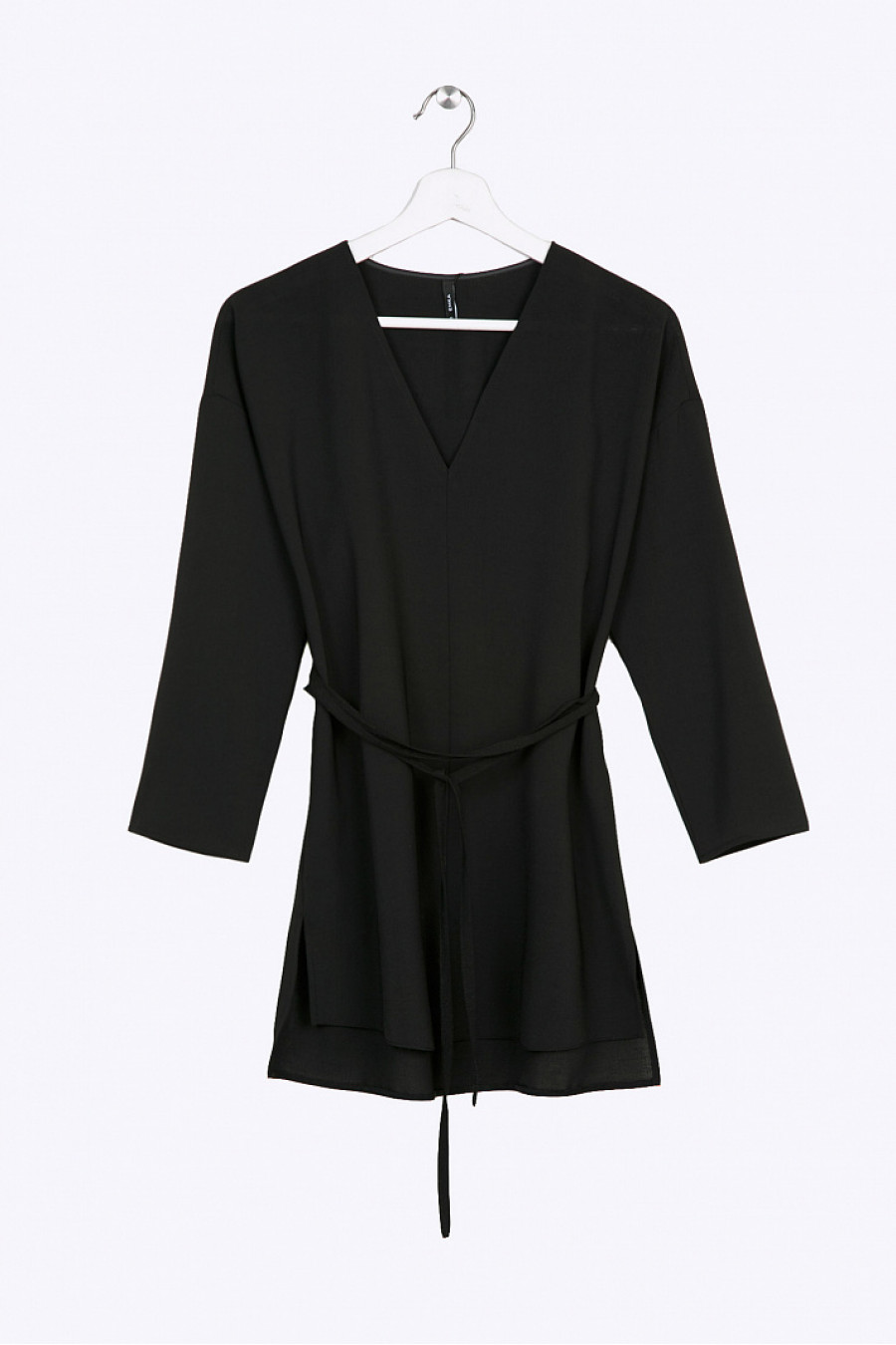 образный вырез горловины, рукава 3/4 с заниженной проймой, разрезы по бокам и асимметричный низ. Линия талии подчеркнута тонким поясом.
