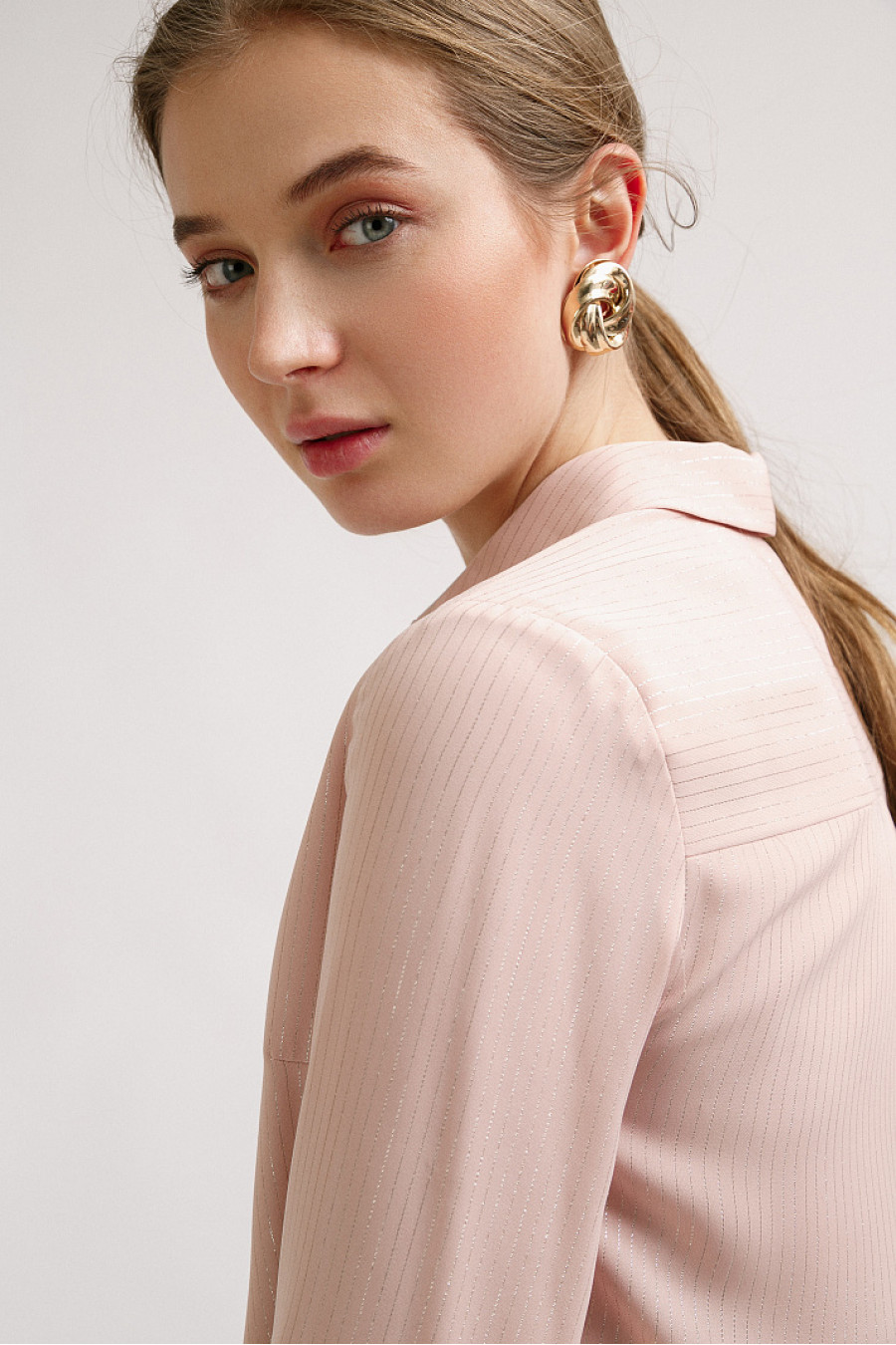 Закрытая блузка в полоску из люрекса. Модель имеет прямой силуэт,рубашечный воротник, планку с пуговицами. Длинные рукава с манжетами на двух пуговицах.