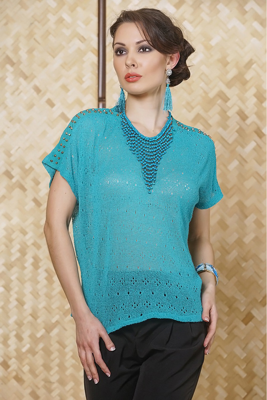 Голубая женская ажурная блуза, свободная, средней длины. Вырез изделия высокий, неглубокий, овальной формы. Рукав-реглан короткий, декорирован золотистыми заклепками. Блуза однотонная, голубого цвета, с мелкими ажурными узорами. Материал изготовления - качественное, мягкое полотно, приятное к телу. Рекомендуется машинная стирка в бережном режиме или вручную.