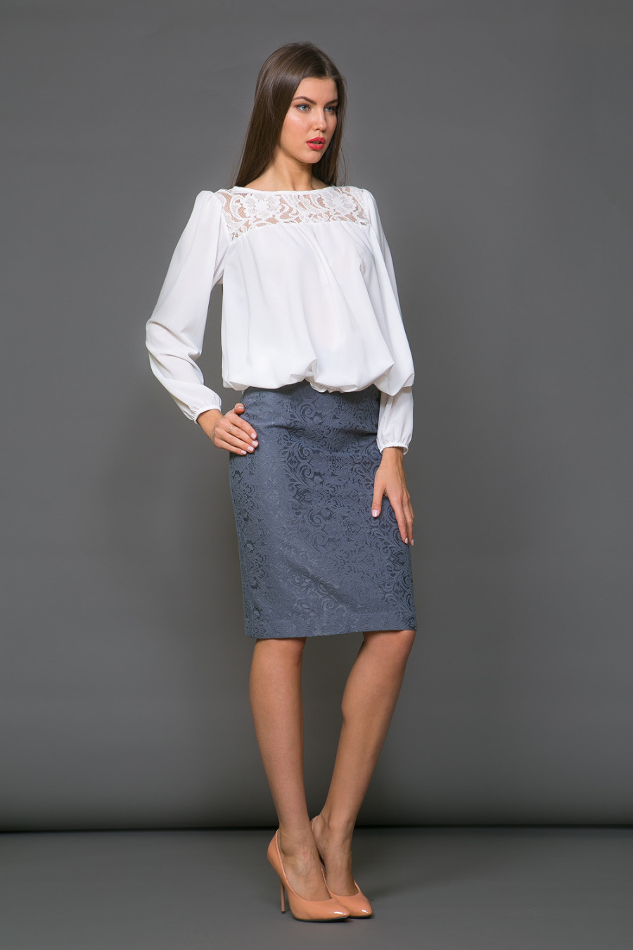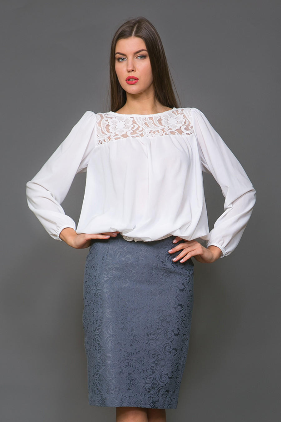 Блузка с длинным рукавом-воланом, с кружевным воротом, рукав-фонарь.