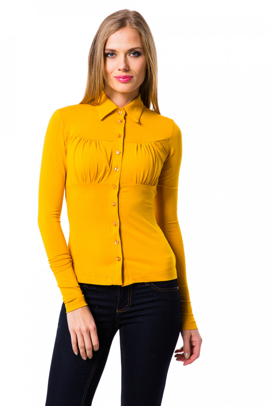 Стильная блузка из качественного материала. Модель приталенного кроя с отложным воротником, застежкой на пуговицы и длинными рукавами. Оригинальной деталью является декориративная сборка на груди. Отличный вариант для офиса и на каждый день.