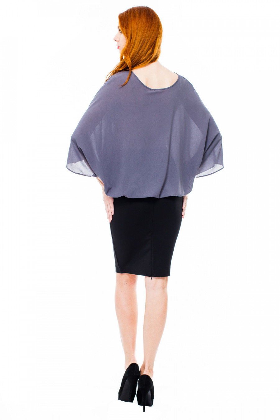 Отличная блузка с эффектными цельнокроеным коротким рукавом «летучая мышь». Модель свободного покроя выполнена из легкой полупрозрачной ткани. Округлая горловина обработана окантовкой. Низ блузки собран на трикотажный пояс. Стильный и соблазнительный вариант.