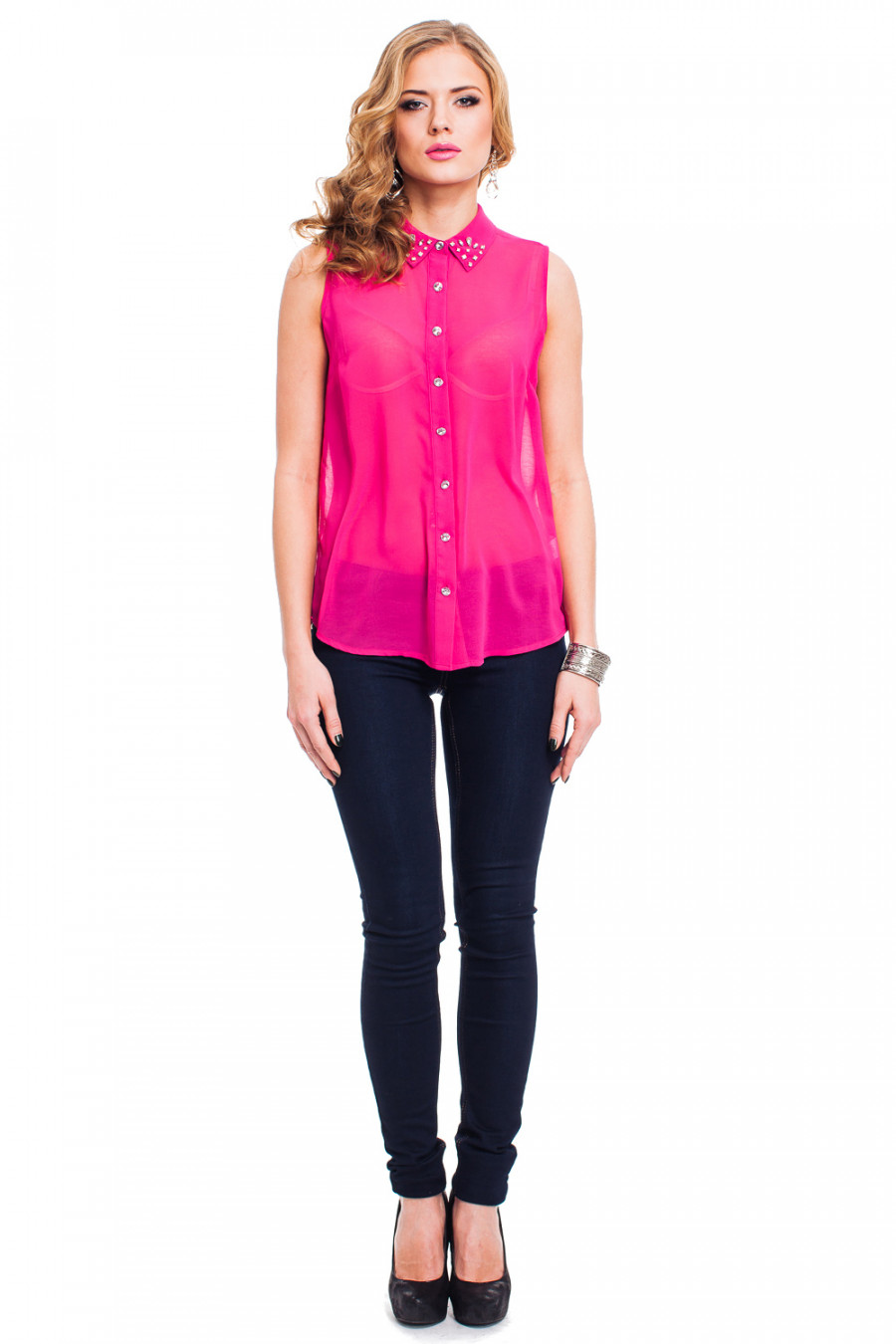 Лаконичный,свободный покрой рубашки выглядит сдержанно и элегантно. Модель без рукавов, с застежкой на стильные стеклянные пуговицы. Стильная деталь - воротник украшен стеклянной фурнитурой по уголкам. Эта модель прекрасно подойдет как для создания вечернего костюма, так и в качестве удобной модели для повседневной жизни.