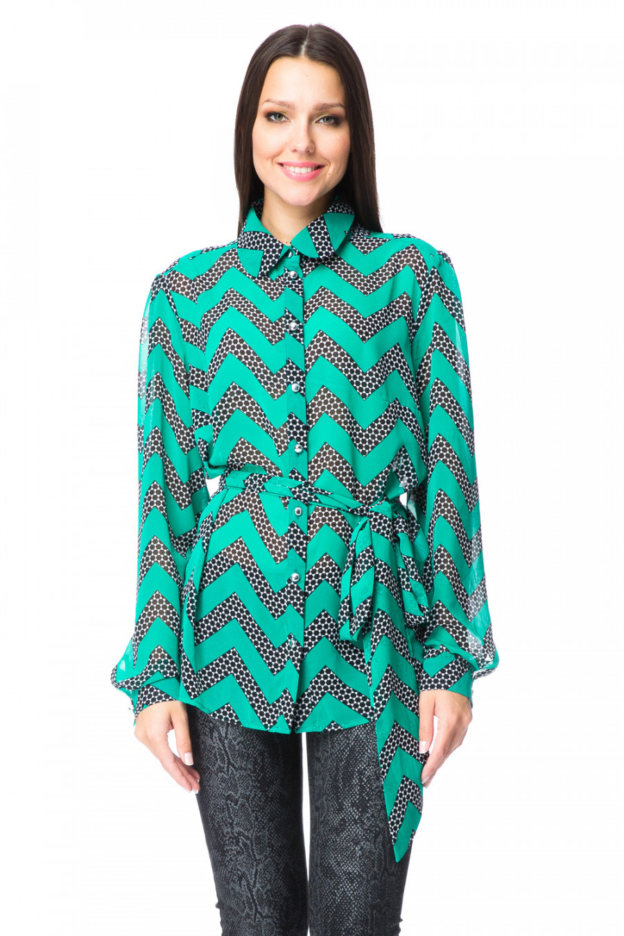 Эффектная и нарядная блузка из полупрозрачной шифоновой ткани полуприлегающего силуэта. Рукава втачные длинные, манжет с застяжкой на пуговицу. Застежка обработана узкой планкой на петли и пуговицы с перламутровым эффектом. Воротник отложной с закругленными концами и съемным бантом. Стильная блузка-идеальный выбор для создания нежного женственного образа.