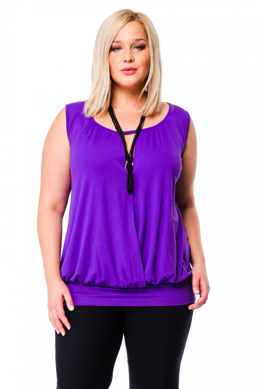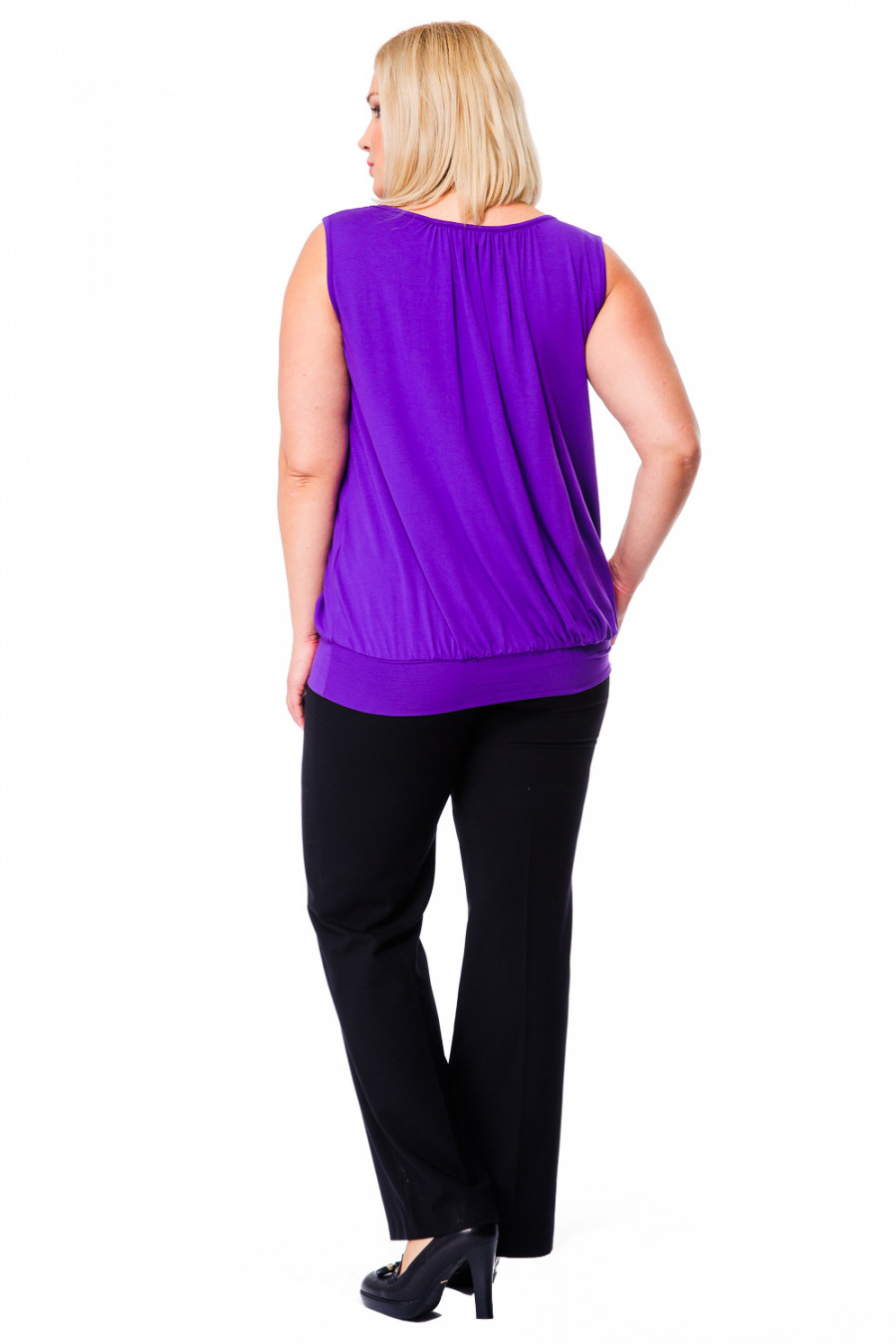 Летняя блузка свободного покроя без рукавов. Модель оригинального объемного дизайна со сборками и с имитацией запаха в центральной части, нижняя часть декорирована широким манжетом в виде резинки, выполнена из качественной вискозы. Отличный летний вариант.