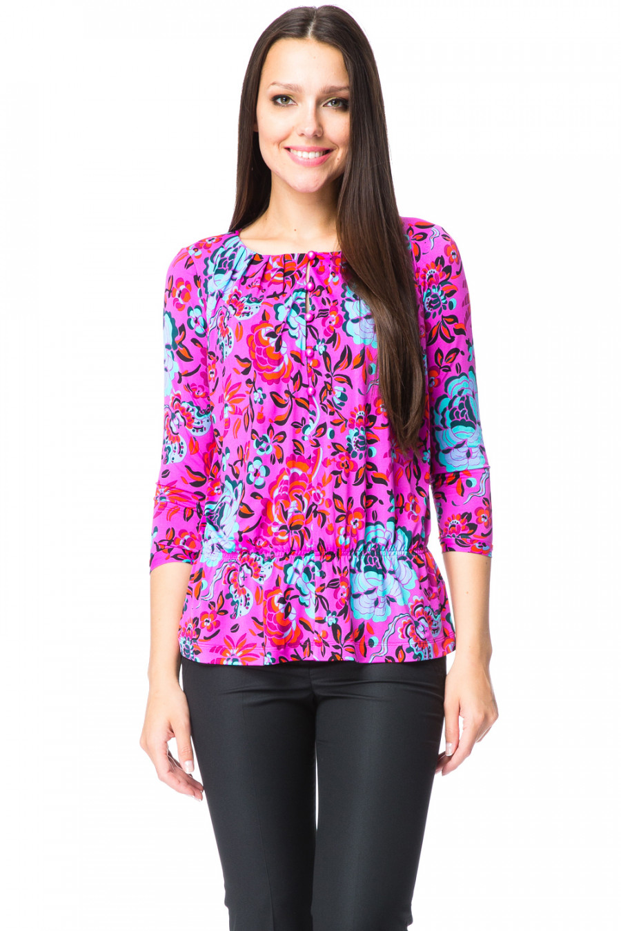 Стильная блузка с округлым вырезом горловины с рукавами 3/4. Модель свободного кроя, выполнена из струящегося материала микрофибры и украшена актуальным принтом. По центральной части модель оформлена вырезом с застёжкой на пуговицы, на талии имеется тонкая резинка. Оригинальная модель прекрасно дополнит Ваш образ.