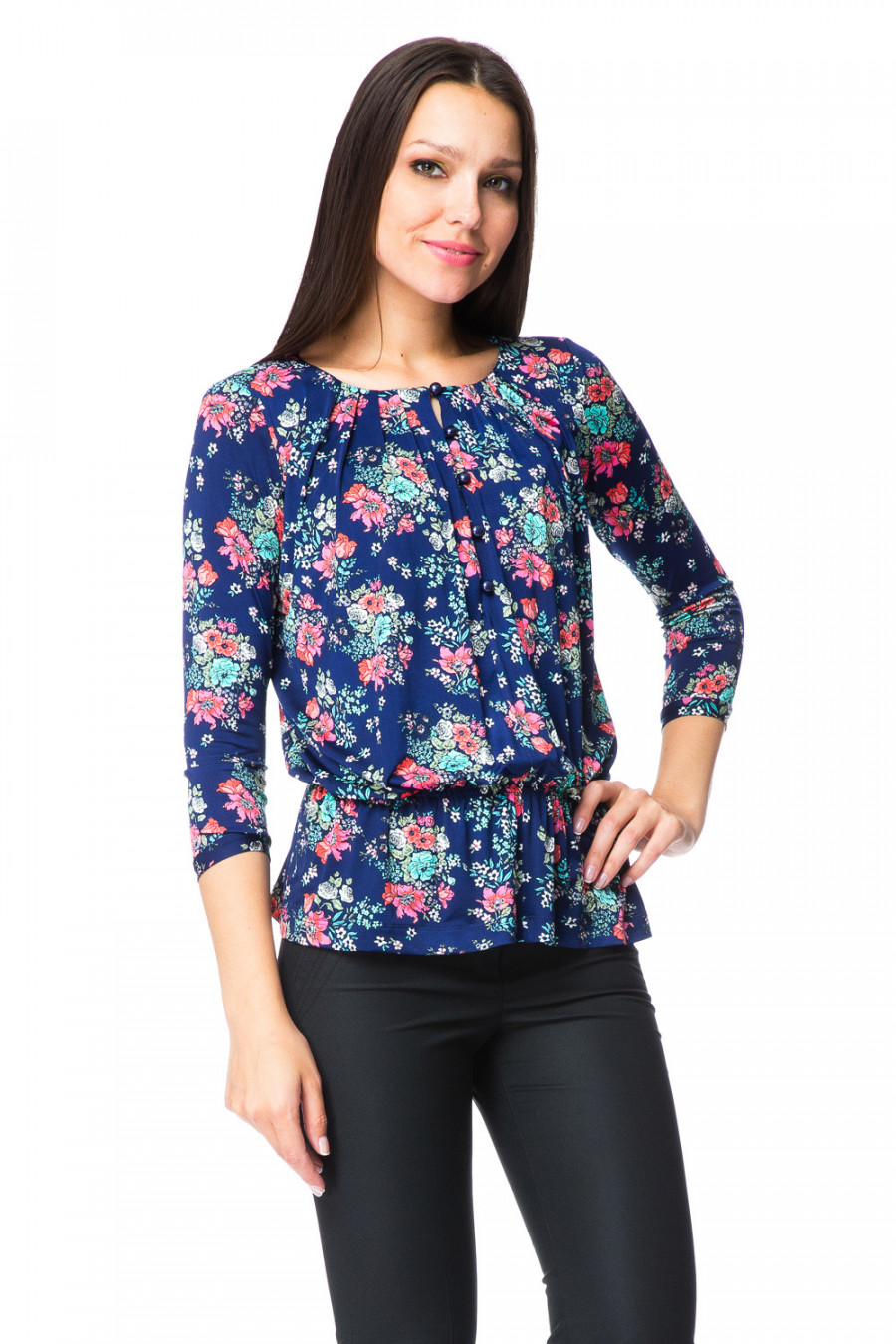 Стильная блузка с округлым вырезом горловины с рукавами 3/4. Модель свободного кроя, выполнена из струящегося материала микрофибры и украшена актуальным принтом. По центральной части модель оформлена вырезом с застёжкой на пуговицы, на талии имеется тонкая резинка. Оригинальная модель прекрасно дополнит Ваш образ.