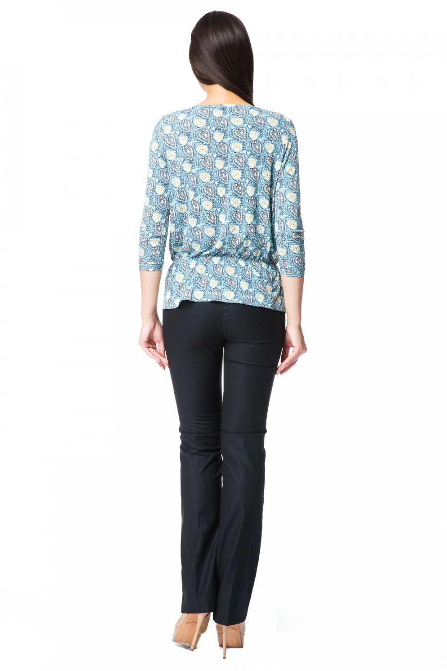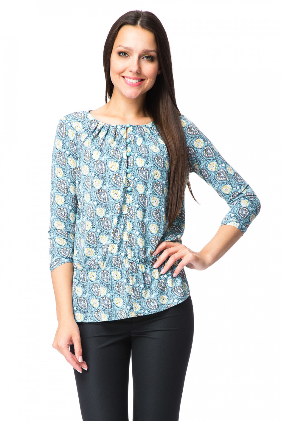 Оригинальная блузка с округлым вырезом горловины с рукавами 3/4. Модель свободного кроя, выполнена из струящегося материала микрофибры и украшена актуальным принтом нежных тонов. По центральной части модель оформлена вырезом с застёжкой на пуговицы, на талии имеется тонкая резинка. Оригинальная модель прекрасно дополнит Ваш образ.