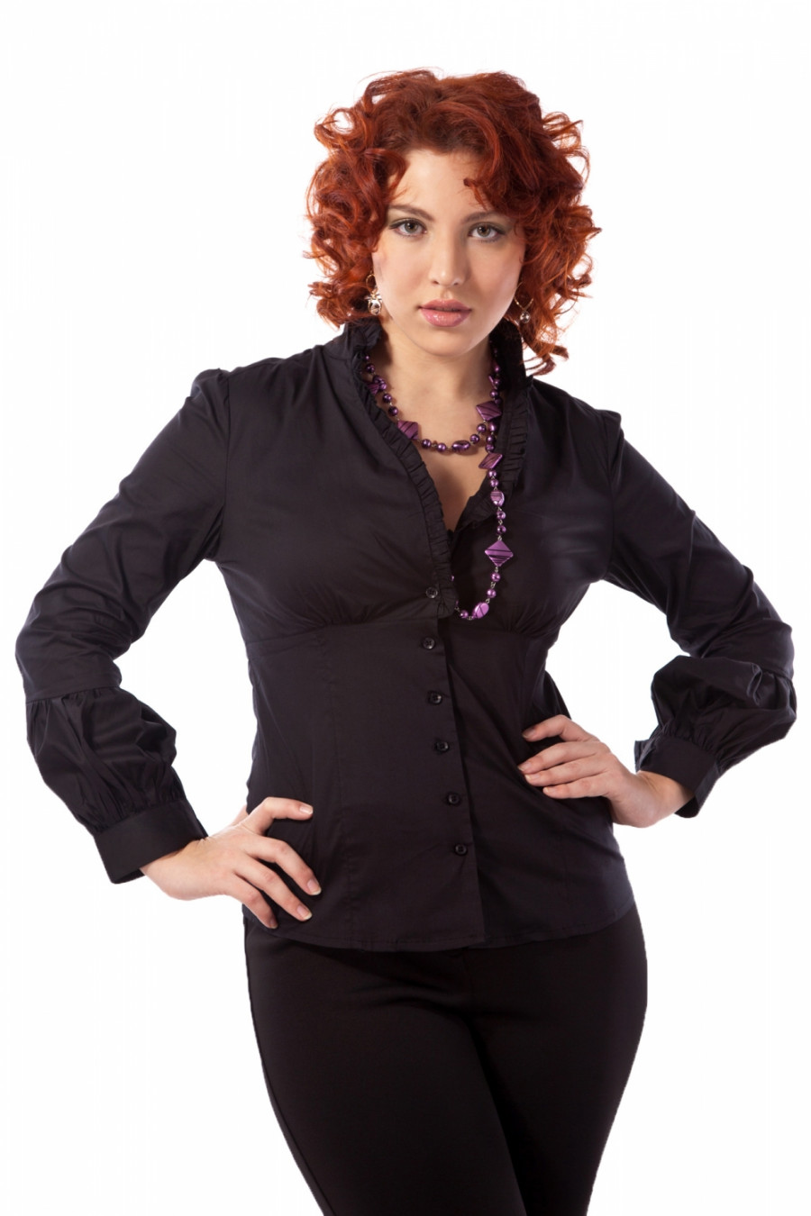 Эта стильная рубашка подойдет любительницам нестандартного мышления и высоких амбиций. Воротник, обрамленный рюшами, выгодно подчеркнет Вашу линию декольте, а воланы на рукавах завершат композицию. Прекрасно скроенная, оригинальная рубашка станет любимой вещью в Вашем гардеробе!