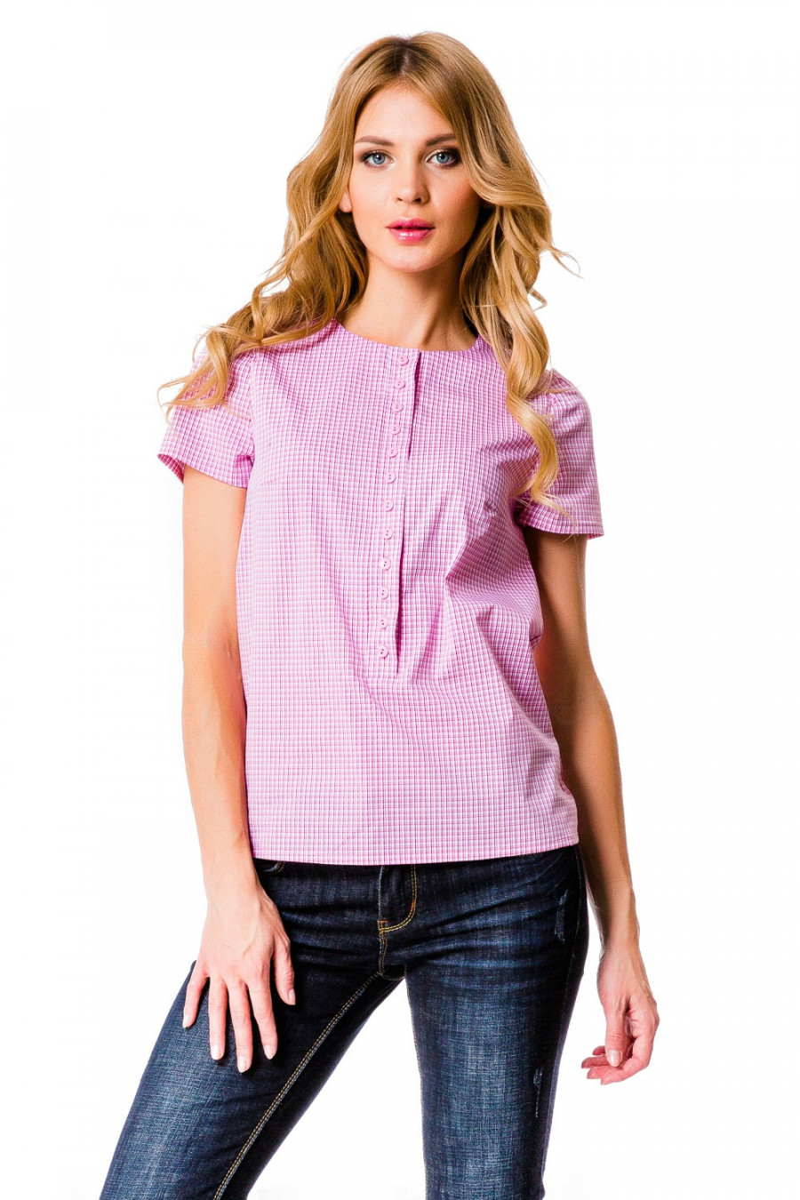 Летняя блузка с коротким рукавом и округлым вырезом горловины. Модель прямого покроя, от ворота по центральной линии планка с застежкой на пуговицы, выполнена из приятной тонкой текстильной ткани и украшена стильным принтом в актуальных цветах этого сезона. Изделие будет удачно гармонировать с любыми предметами гардероба