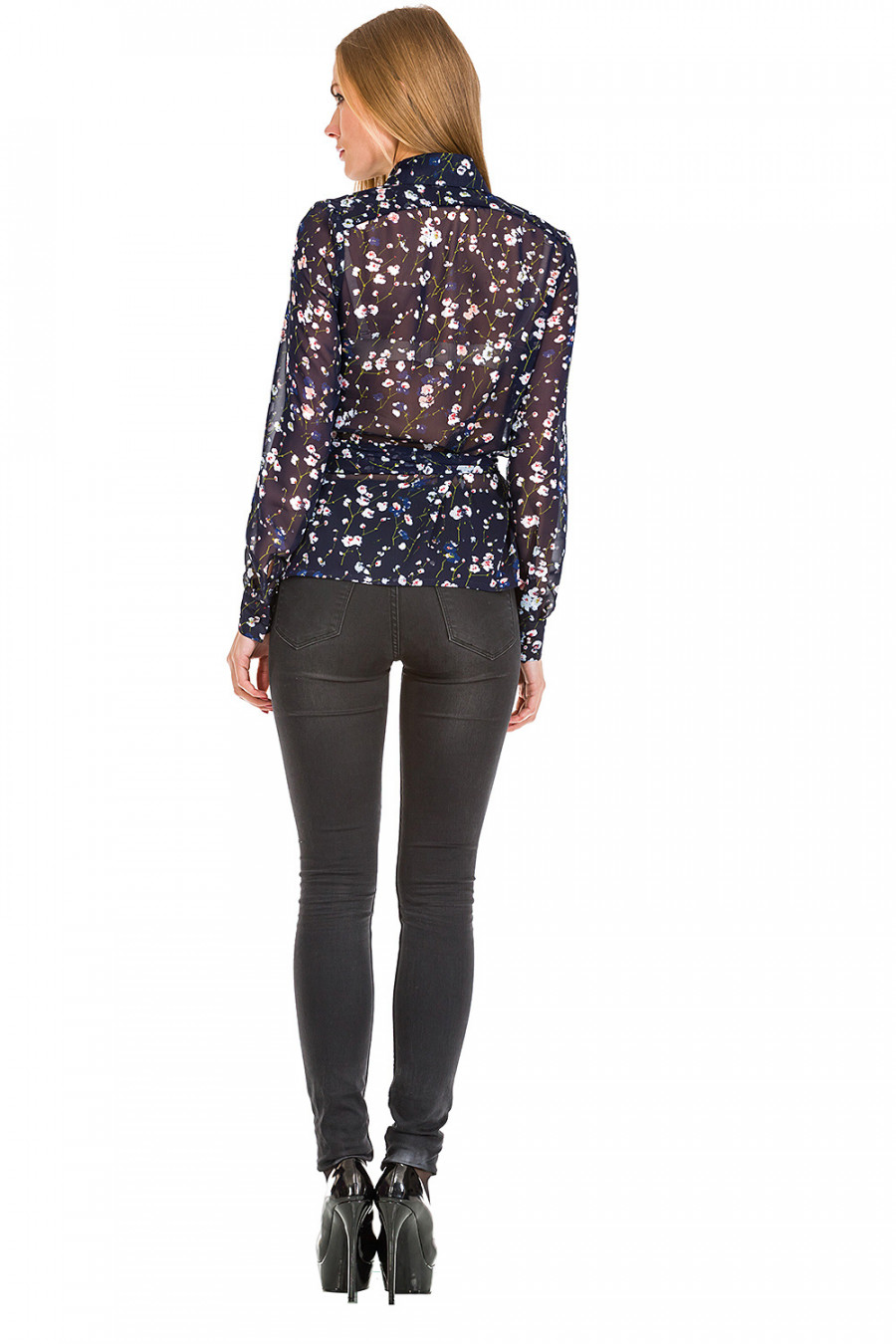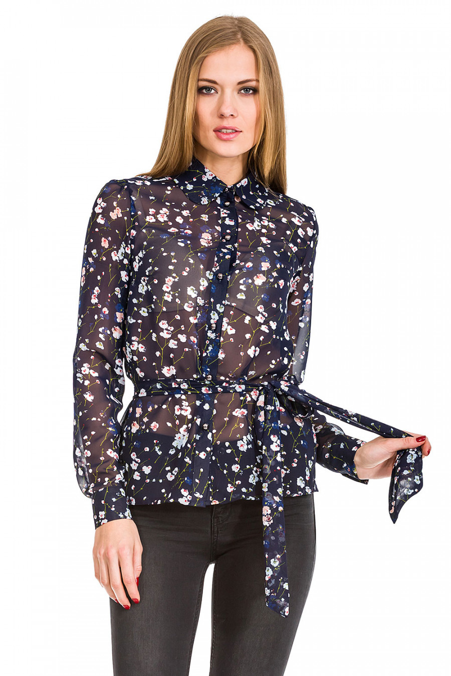 Стильная блузка из полупрозрачной шифоновой ткани полуприлегающего силуэта. Рукава втачные длинные, манжет с застежкой на пуговицу. Застежка обработана узкой планкой на петли и пуговицы с перламутровым эффектом. Воротник отложной с закругленными концами и съемным бантом. Модель украшена оригинальным принтом в мелкий цветок.Стильная блузка-идеальный выбор для создания нежного женственного образа.