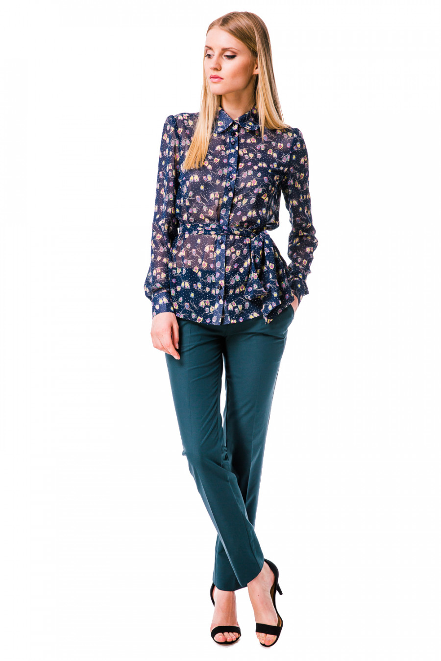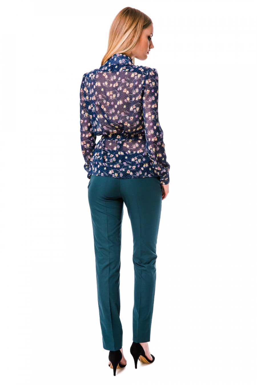 Изящная блузка из воздушного полотна-шифона. Модель с длинным рукавом и отложным воротником. По центральной части застёжка на металлические пуговицы. Рукава декорированы манжетами на пуговицах. Ворот украшен съёмным бантом. Стильная модель с оригинальным принтом контрастного цвета.