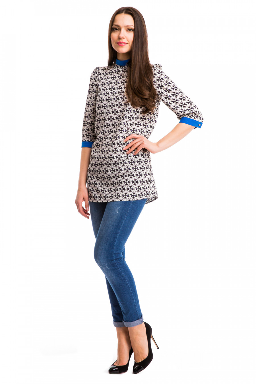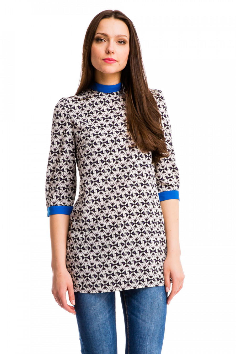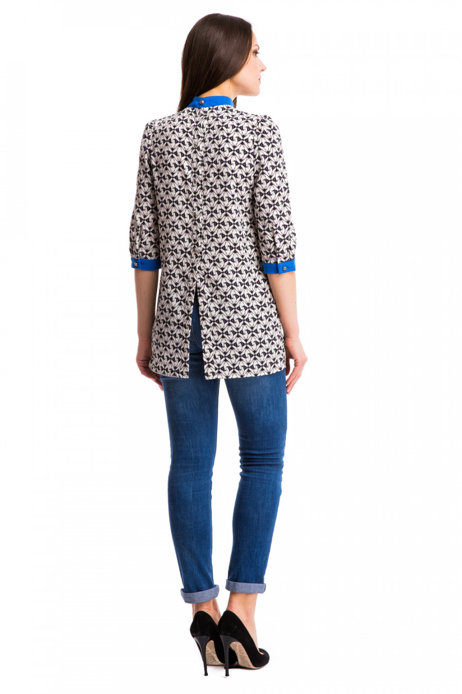 Стильная блузка удлинненого типа. Модель свободного кроя с рукавами 3/4 и воротником-стойкой. Рукава оформлены в виде фонариков с манжетами. На спинке и манжетах модель украшена застежкой на металлические пуговицы. Блузка выполнена из легкого качественного материала(креп-шифон) и украшена модным принтом. Манжеты выполнены в контрастном синем цвете.Отличный вариант для создания образа.