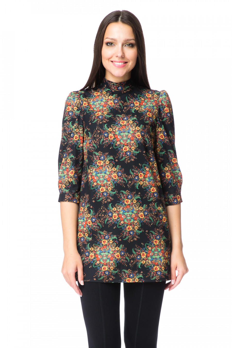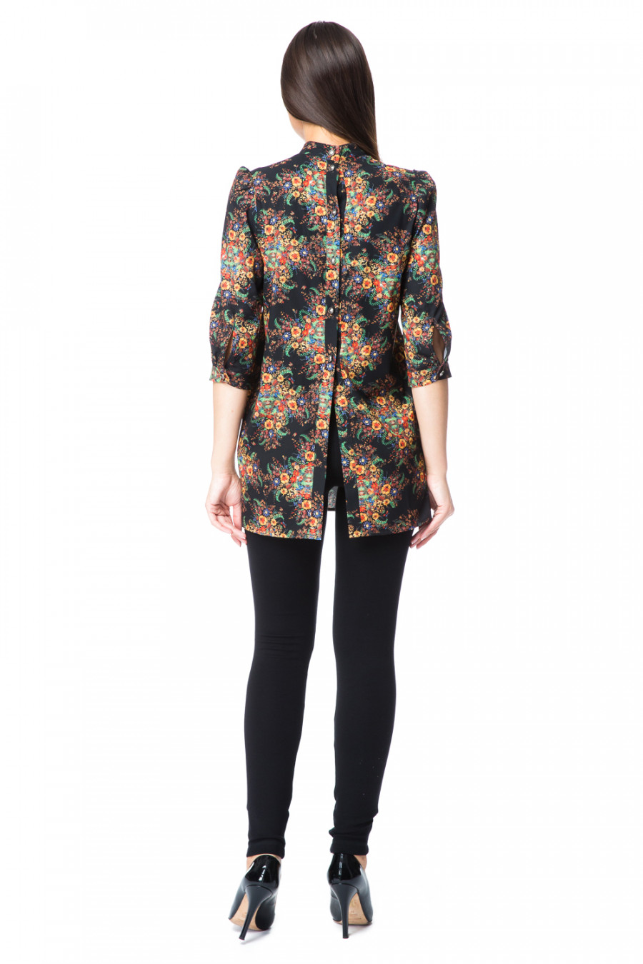 Оригинальная блузка удлинненого типа. Модель свободного кроя с рукавами 3/4 и воротником-стойкой. Рукава оформлены в виде фонариков с манжетами. На спинке и манжетах модель украшена застежкой на металлические пуговицы. Блузка выполнена из легкого качественного материала(креп-шифон). Украшена стильным принтом. Отличный вариант для создания образа.