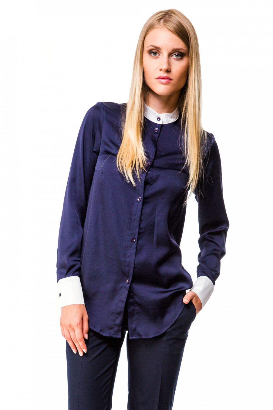 Стильная блузка оригинального дизайна. Модель с длинным рукавом и воротником-стойкой. Застежка обработана узкой планкой на петли и пуговицы. Модель выполнена из качественной ткани, ворот и манжеты декорированы тканью контрастного цвета. Блузка-идеальный выбор для создания нежного женственного образа.