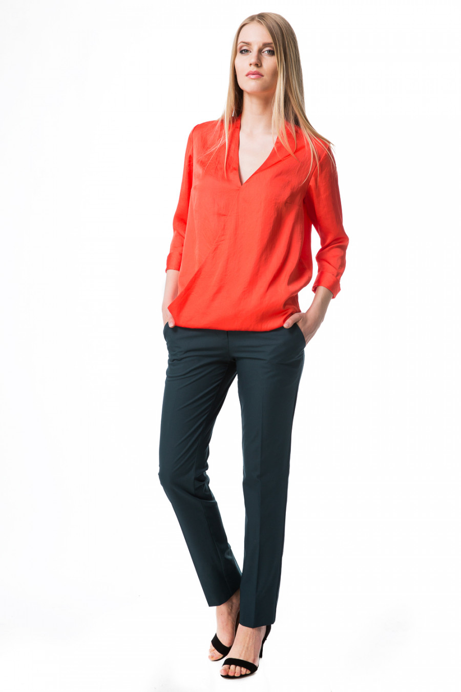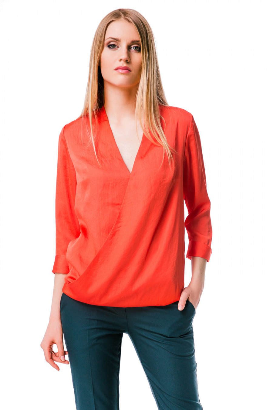 Великолепная легкая блузка. Модель свободного кроя с V-образным вырезом горловины и рукавами 3/4. Лицевая часть оформлена с эффектом ""запаха"". Рукава выполнена с отложными манжетами. Изделие будет удачно гармонировать с любыми предметами гардероба