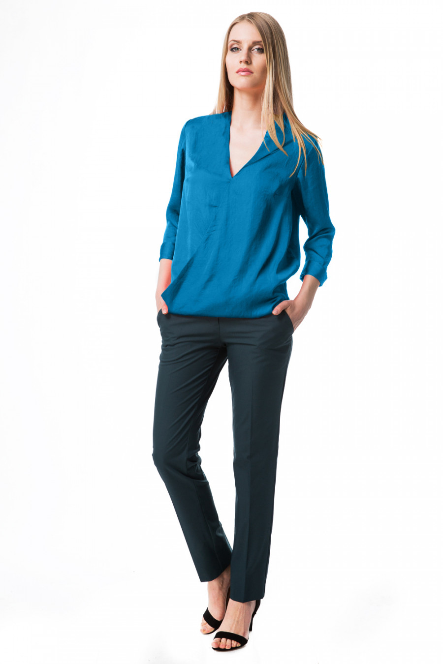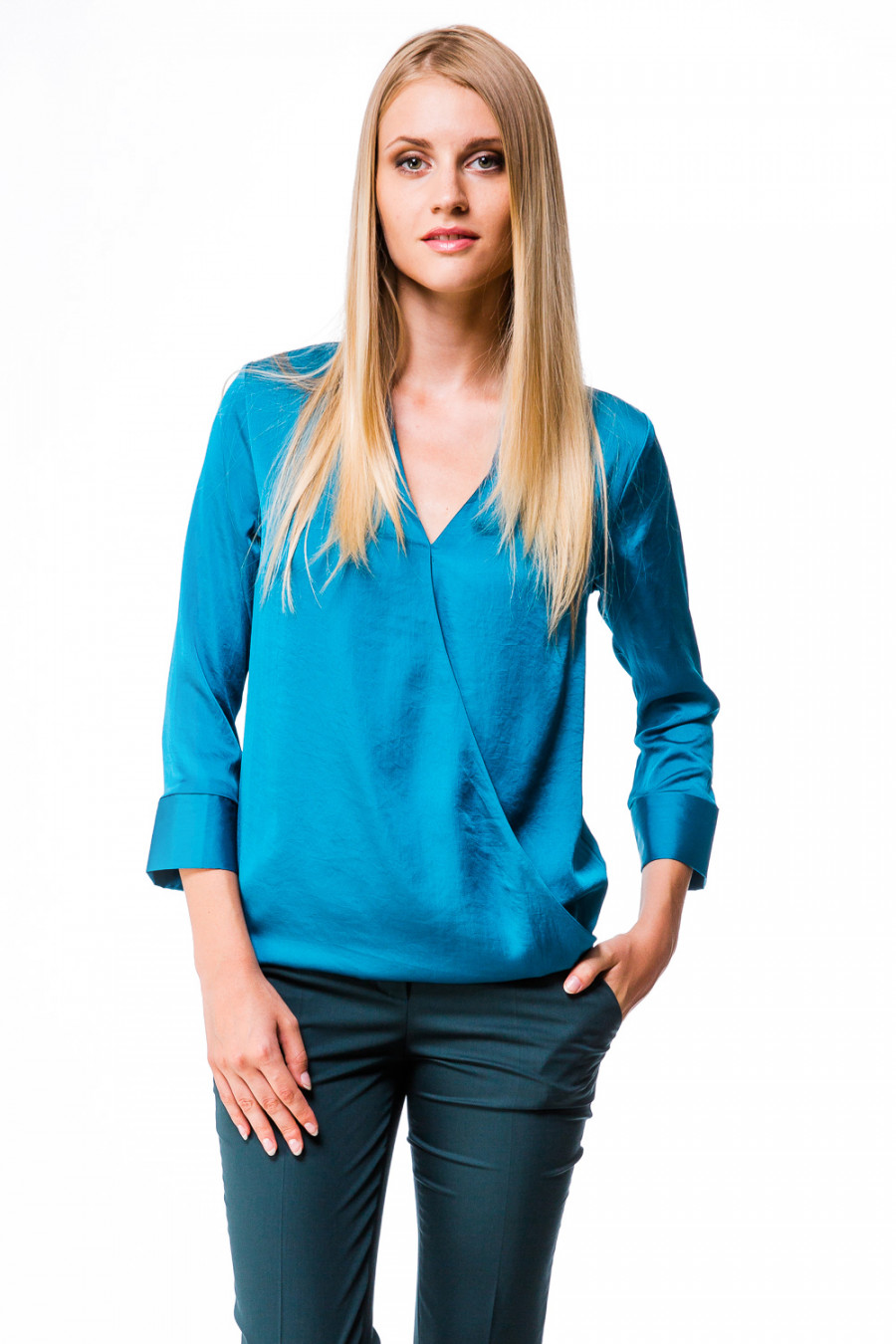 Великолепная легкая блузка. Модель свободного кроя с V-образным вырезом горловины и рукавами 3/4. Лицевая часть оформлена с эффектом ""запаха"". Рукава выполнена с отложными манжетами. Изделие будет удачно гармонировать с любыми предметами гардероба