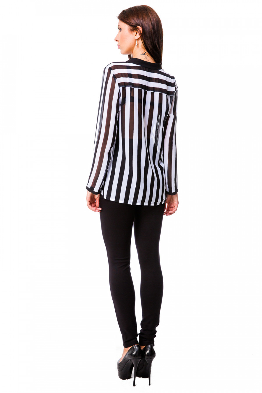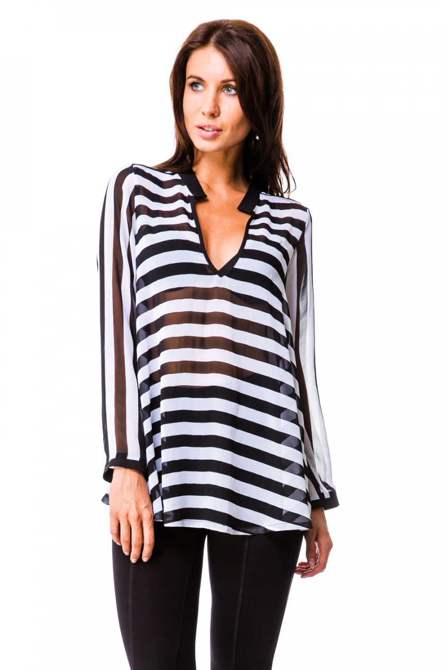Стильная удлинённая блузка. Модель свободного кроя с длинным рукавом и V-образным вырезом горловины. Модель выполнена из лёгкого и воздушного шифона. Край ворота и манжет окантован контрастным цветом. Блузка декорирована принтом в черно-белую полоску. Оригинальное решение для составления полного и гармоничного образа.