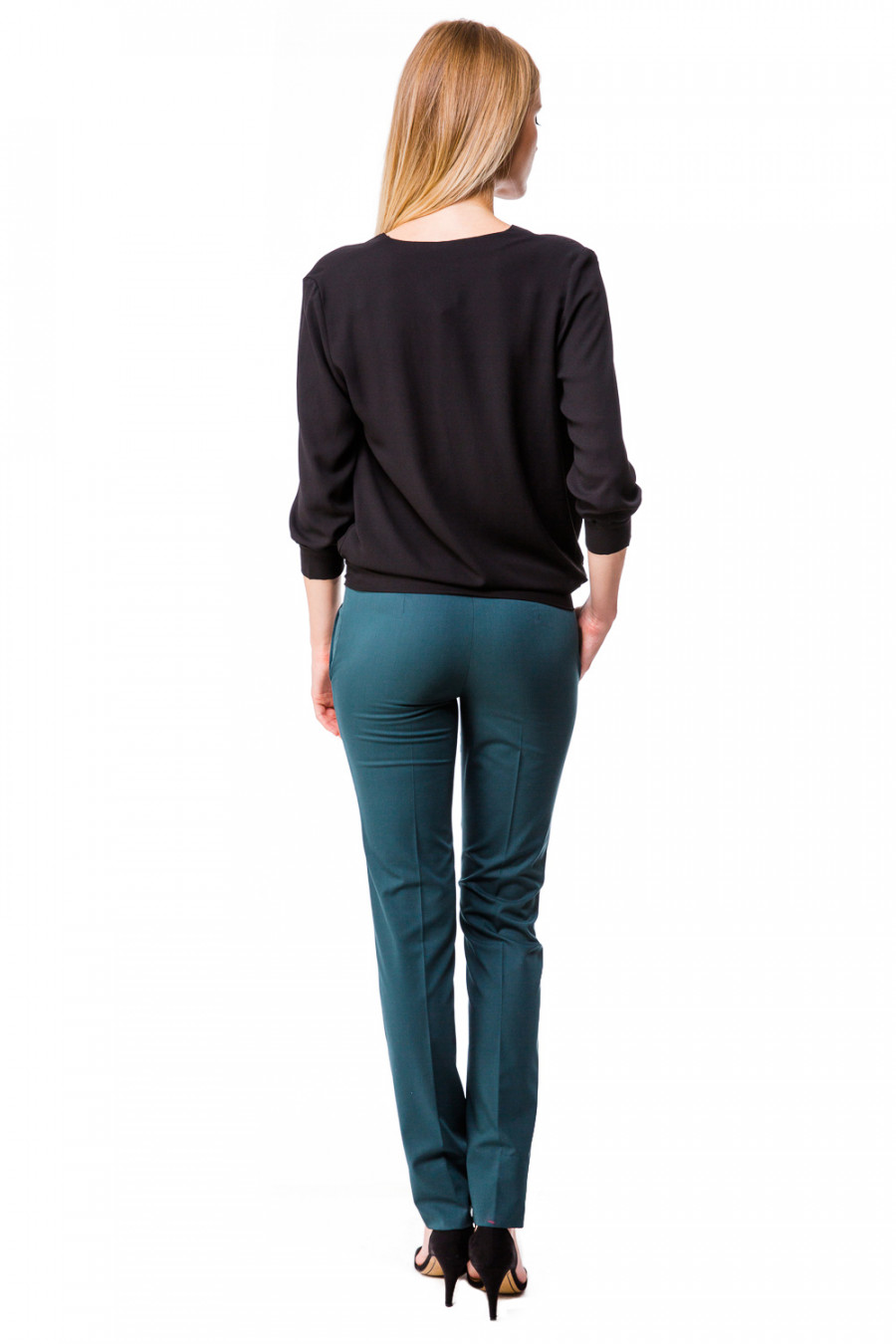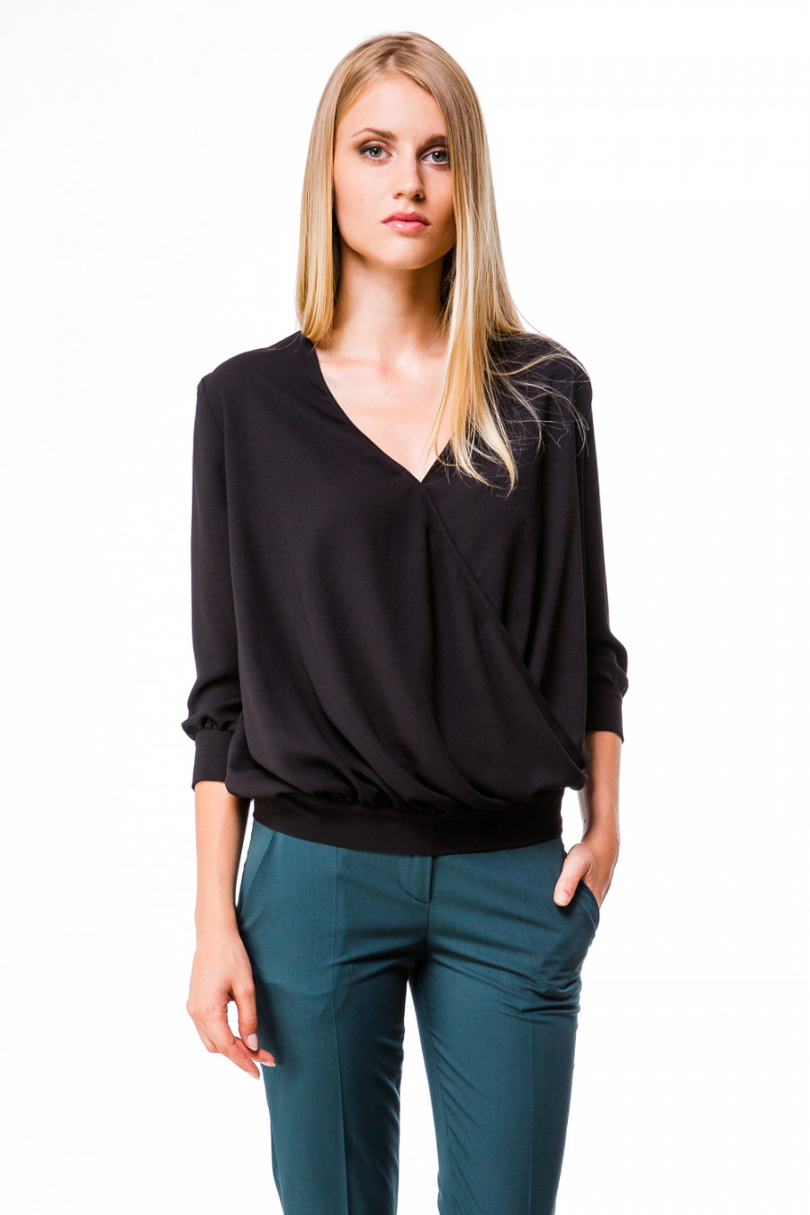 Великолепная легкая блузка. Модель свободного кроя с V-образным вырезом горловины и рукавами 3/4. Лицевая часть оформлена с эффектом "запаха". Рукава выполнены с отложными манжетами. Изделие будет удачно гармонировать с любыми предметами гардероба