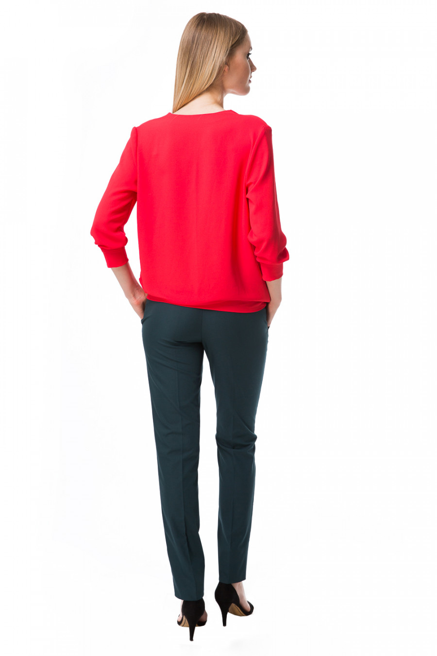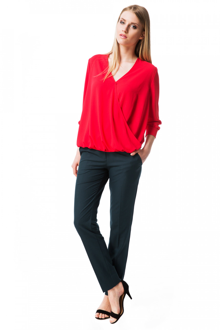 Великолепная легкая блузка. Модель свободного кроя с V-образным вырезом горловины и рукавами 3/4. Лицевая часть оформлена с эффектом "запаха". Рукава выполнены с отложными манжетами. Изделие будет удачно гармонировать с любыми предметами гардероба