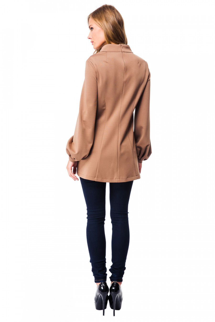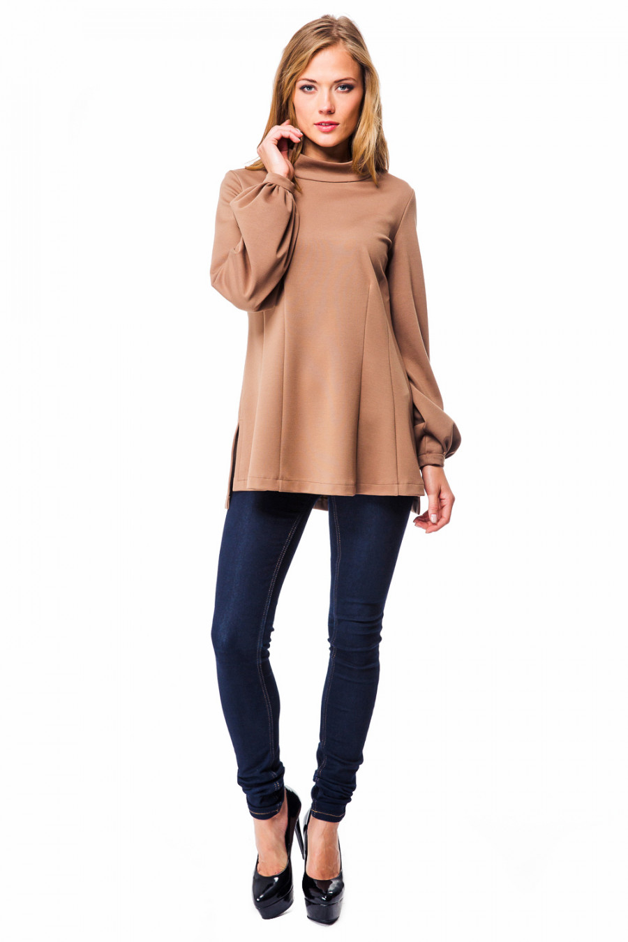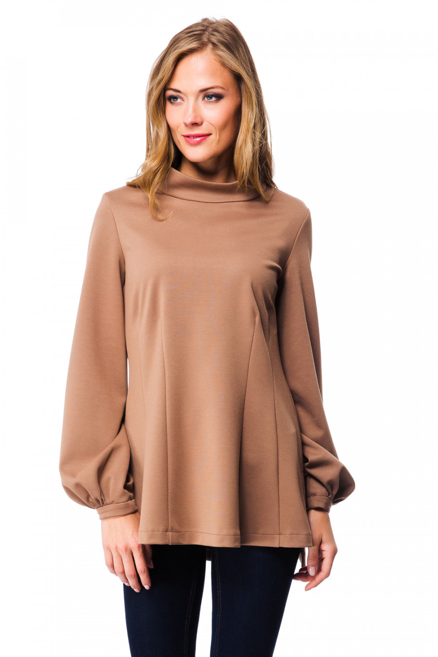 Оригинальная и нарядная блузка с длинным рукавом и воротом-стойкой. Модель выполнена из плотной эластичной ткани приталенного силуэта. Задняя часть немного удлинена, по бокам имеются разрезы. Рукава, по линии манжет, выполнены с эффектом ""фонарик"" . Сзади-застёжка на молнию. Стильная и удобная модель придётся по вкусу ценителям комфорта. Блузку можно сочетать и с брюками, и леггинсами.
