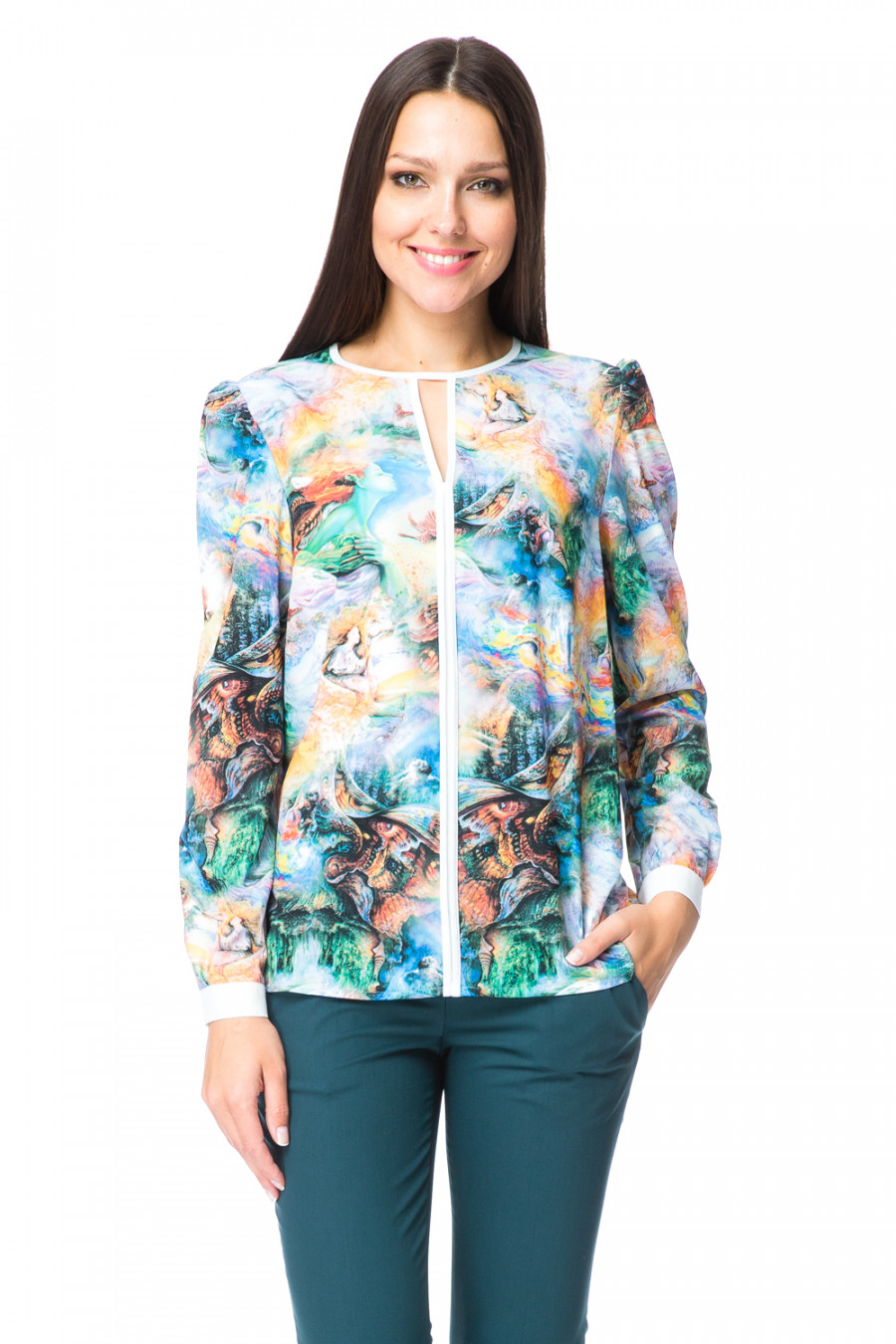 Модная лёгкая блузка. Модель свободного кроя с округлым вырезом горловины и длинными рукавами. Украшена светлым принтом. По линии ворота и центральной части модель декорирована контр