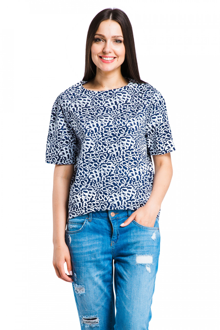 Модная модель блузы свободного кроя. Изделие с округлым вырезом горловины и короткими рукавами-реглан. Передняя часть-укороченная, задняя-выполнена на удлинение. Модель украшена принтом. Изготовлено из качественного материала- хлопок, который прекрасно держит форму. Стильная и актуальная вещь для базового гардероба.