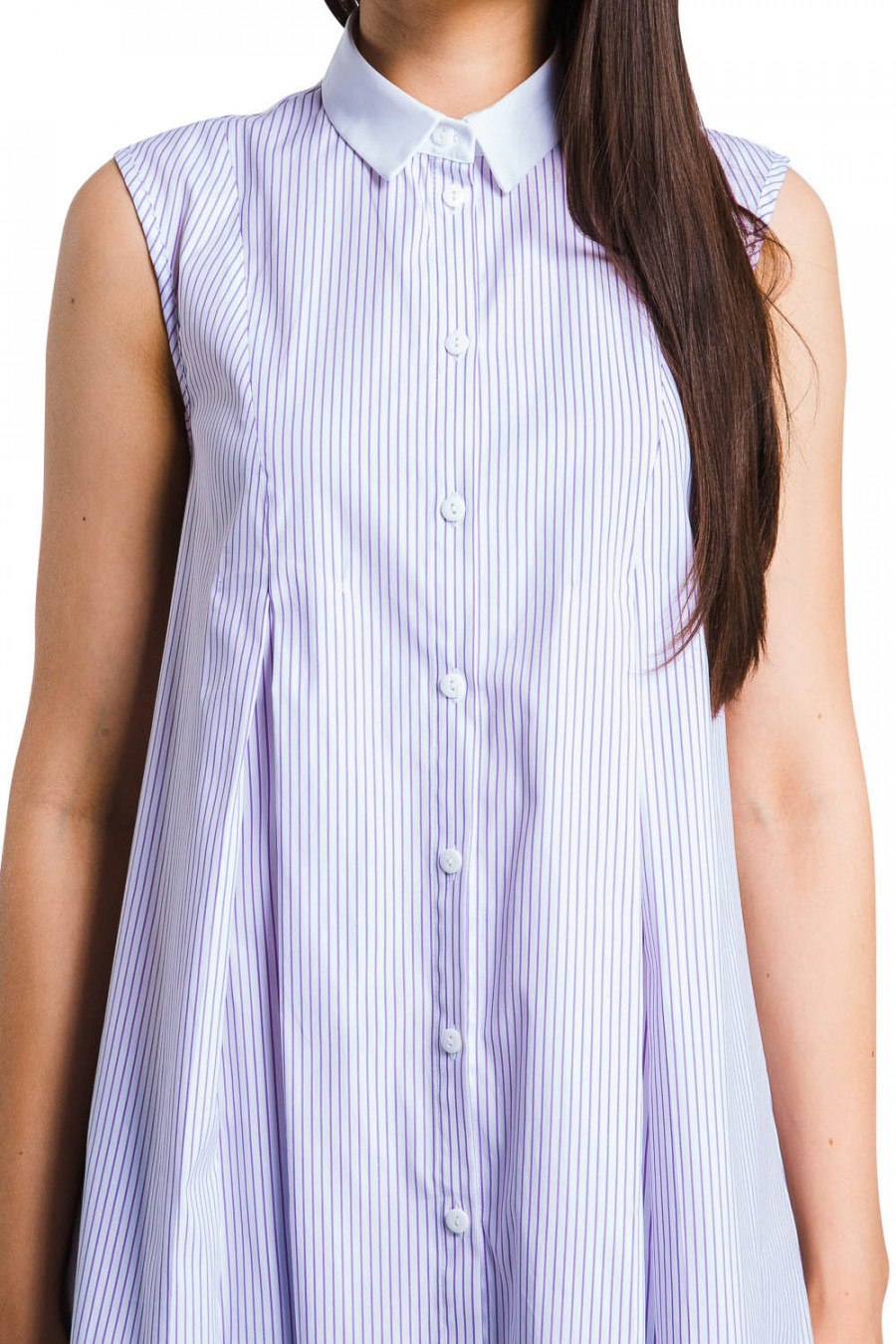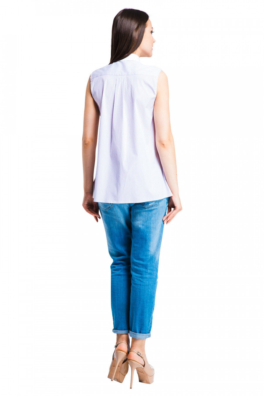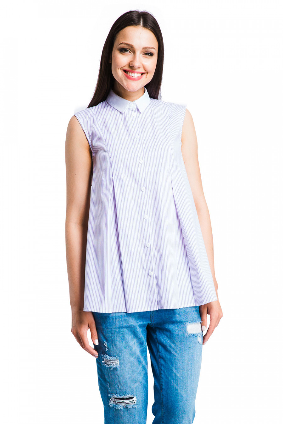 Лаконичный, свободный покрой блузки выглядит сдержанно и элегантно. Модель свободного кроя без рукавов с застёжкой на стильные пуговицы. От линии груди имеются сборки. Выполнена из легкого материала и украшена принтом в тонкую полоску. Модель прекрасно подойдёт как для создания вечернего образа, так и в качестве удобной модели для повседневной жизни.