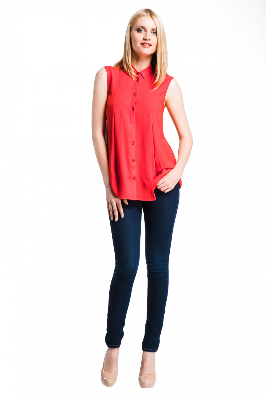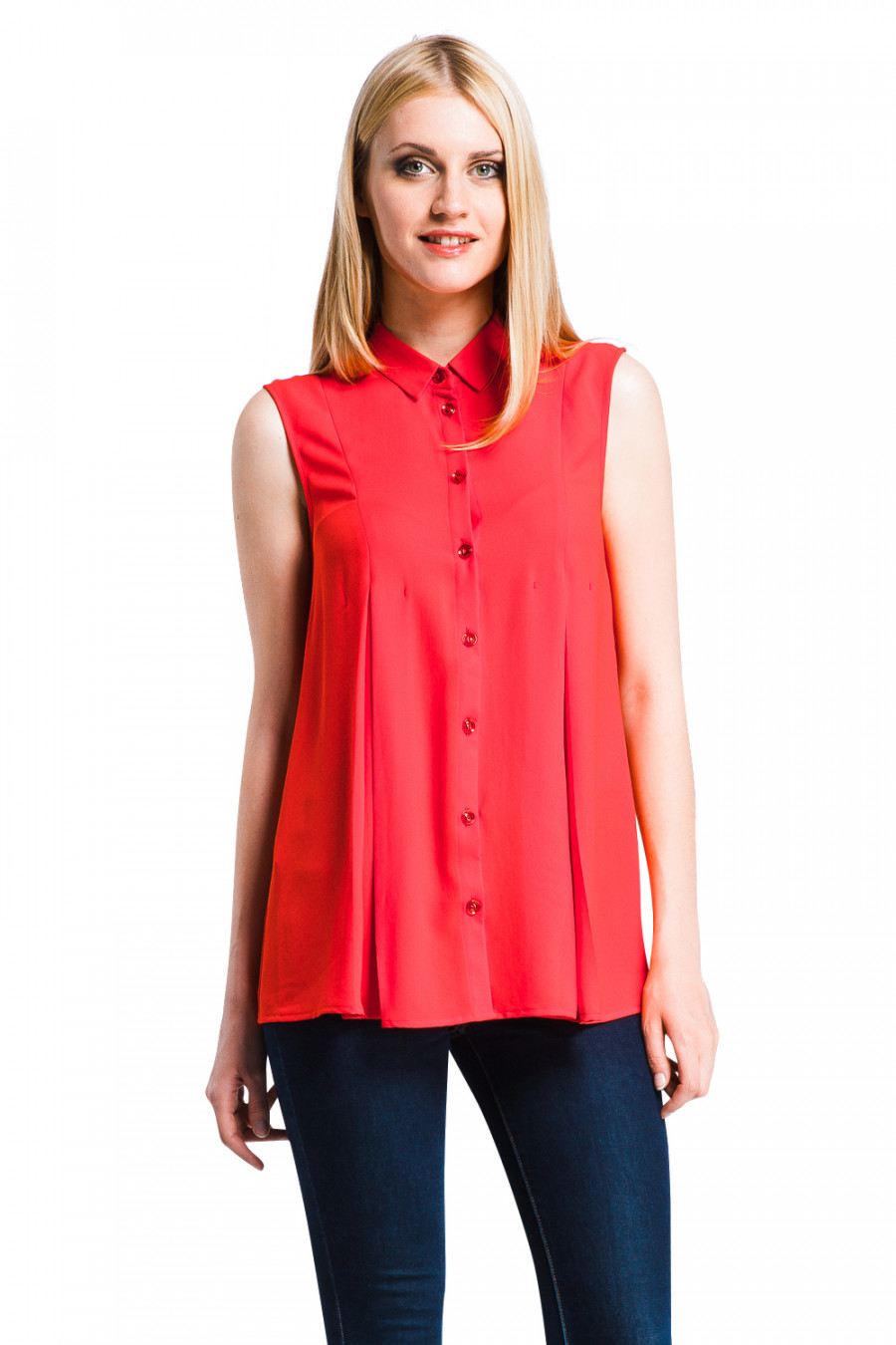 Лаконичный,свободный покрой блузки выглядит сдержанно и элегантно. Модель свободного кроя без рукавов с застёжкой на стильные стеклянные пуговицы. От линии груди имеются сборки. Выполнена из воздушного креп-шифона. Эта модель прекрасно подойдёт как для создания вечернего образа, так и в качестве удобной модели для повседневной жизни.
