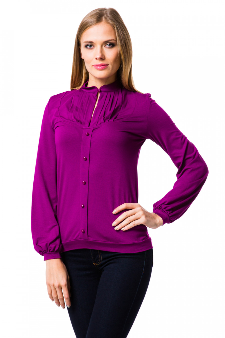 Очаровательная блузка с длинным рукавом и воротником-стойкой с застежкой на пуговицу. Модель свободного покроя, на груди небольшие сборки и вырез. Передняя планка по центру декорирована пуговицами. Рукава свободного покроя с небольшими манжетами. Изделие станет замечательным дополнением к Вашему гардеробу.