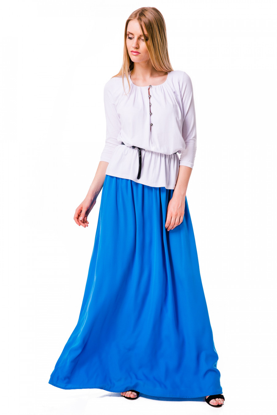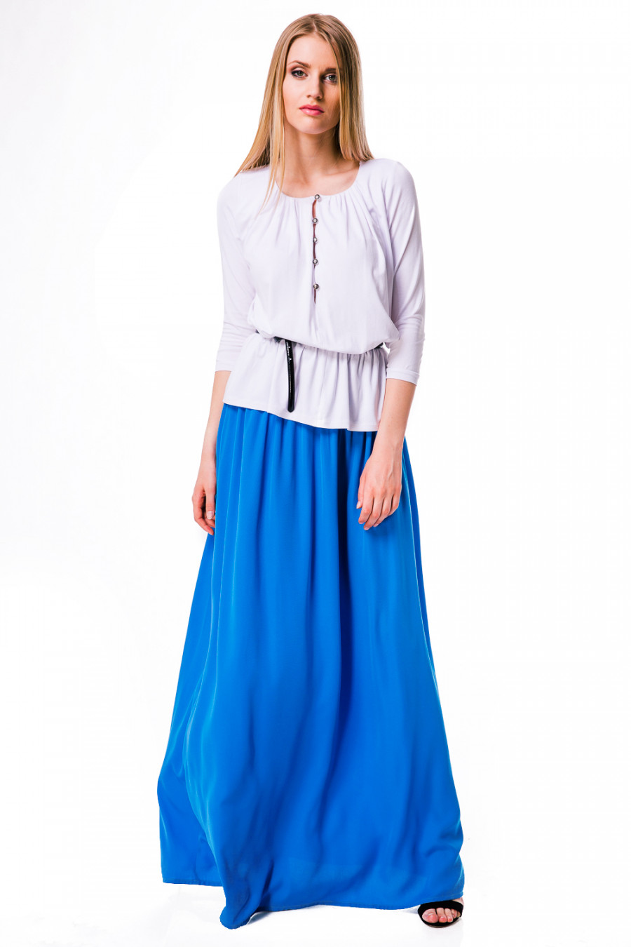 Модная блузка свободного покроя. Модель с округлым вырезом горловины и рукавами 3/4 выполнена из качественной вискозы. Блузку разделяет тонкая резинка на линии талии. Горловина украшена декоративным элементом в виде застежки на пуговицы. Данная модель-незаменимая для создания образа "Casual"