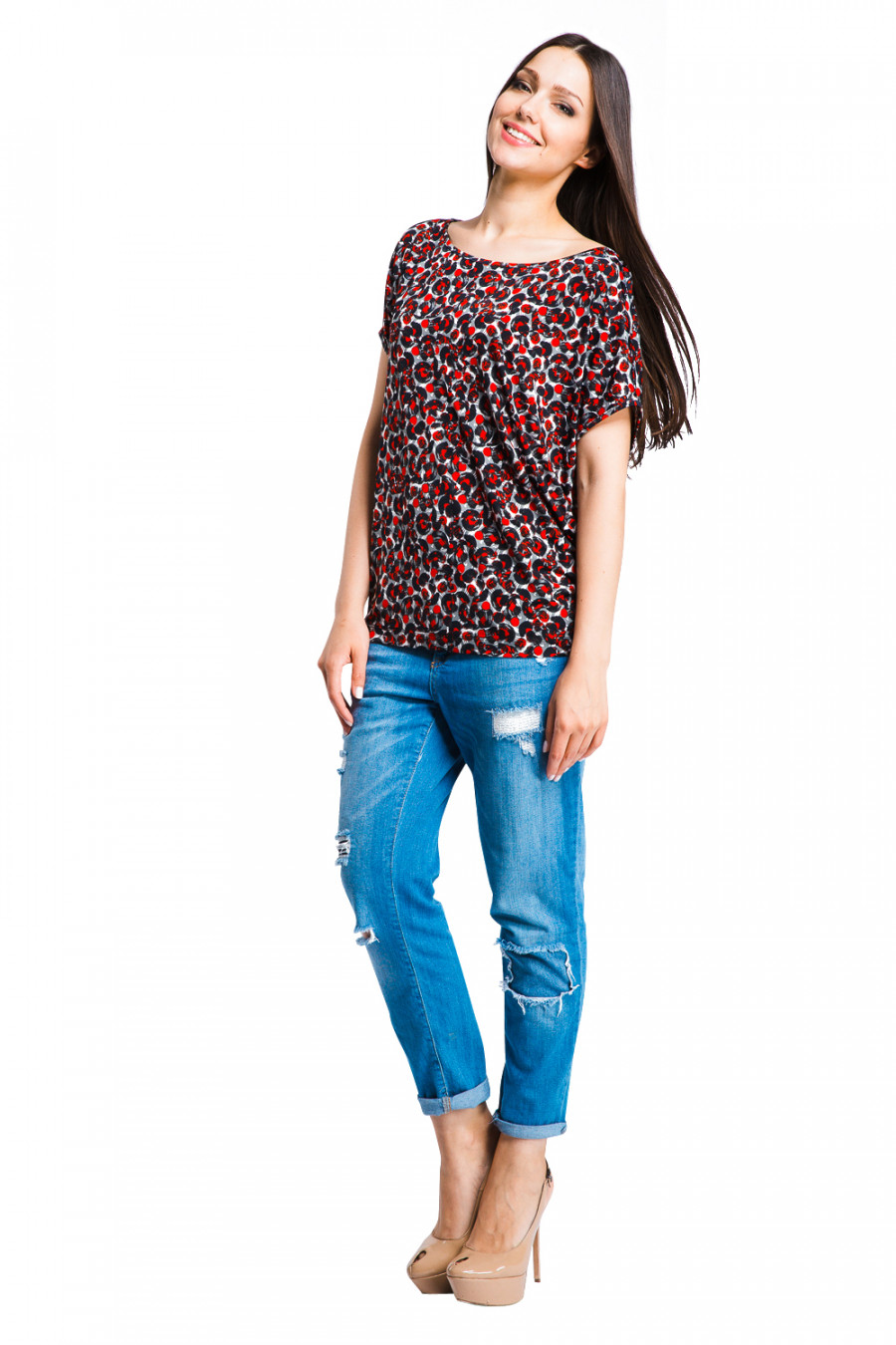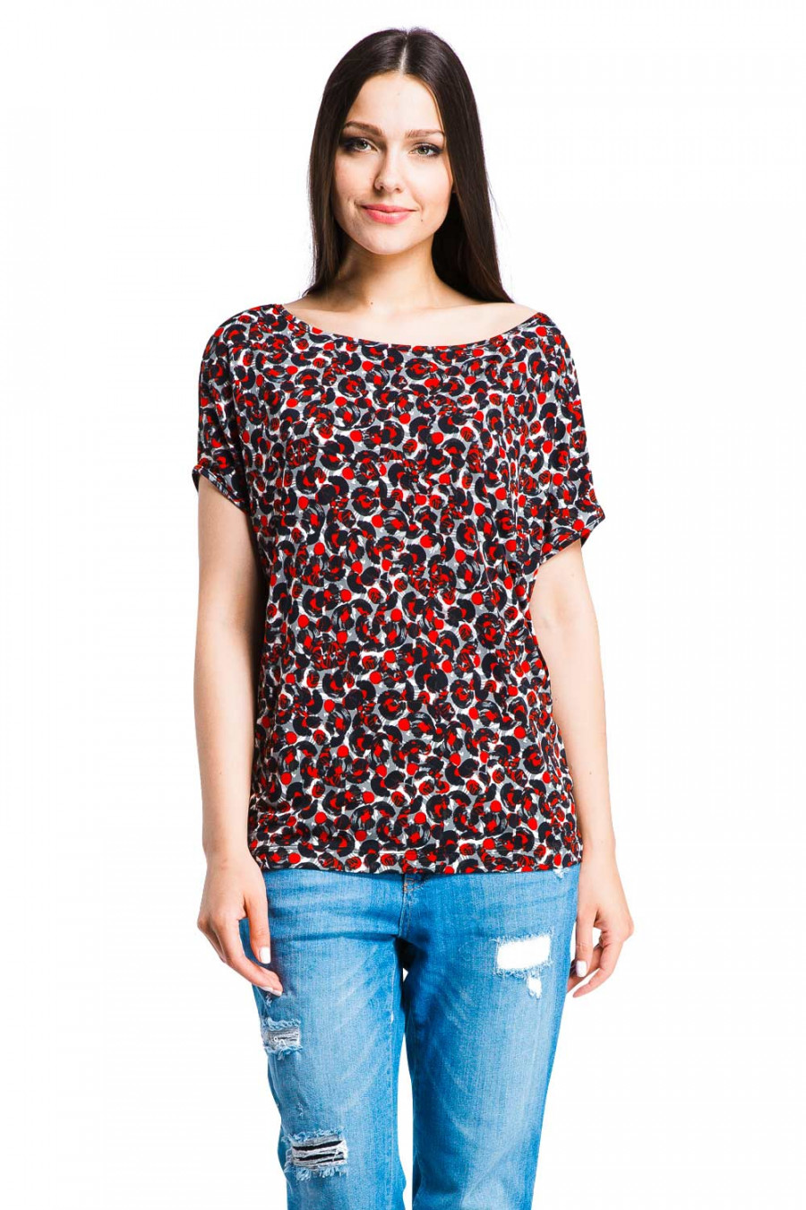 Стильная блузка свободного покроя, выполнена в из высококачественной микрофибры. Украшена стильным принтом. Модель с округлым вырезом горловины и прямыми цельнокройными рукавами. Модель будет прекрасно гармонировать с любыми предметами гардероба. Отличный вариант для летних дней.