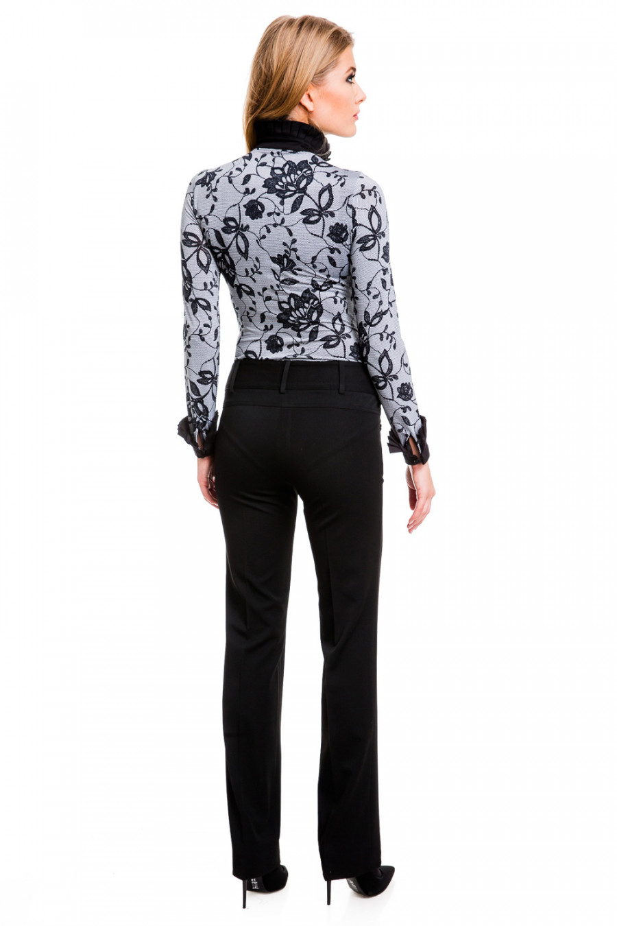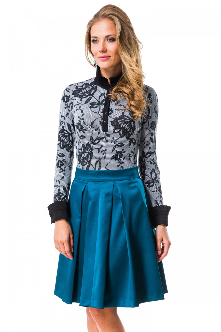 Стильная блузка-боди. Модель облегающего кроя с длинным рукавом. Ворот-стойка и манжеты оформлены в фантазийном дизайне со сборками, на груди застежка на пуговицы. Блузка-боди выполнена из приятной ткани двух фуктур: основная часть из мягкого трикотажа, манжеты и ворот-из сухого текстиля. Модель украшена оригинальным принтом. Незаменимая вещь для ценителей моды.