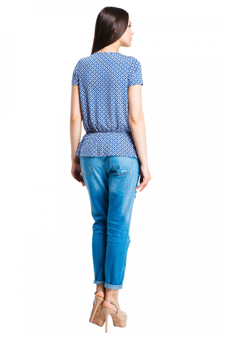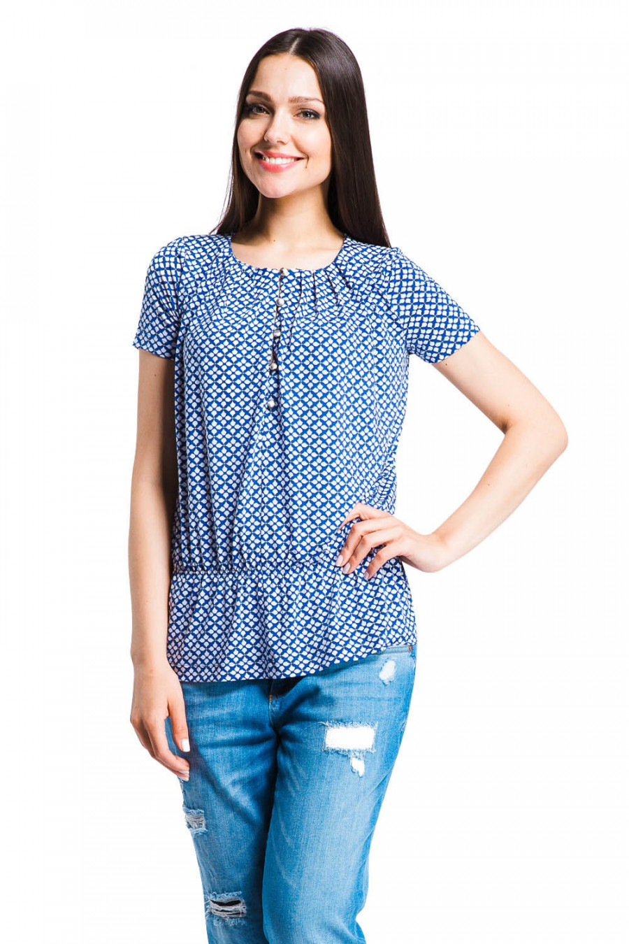 Стильная блузка с округлым вырезом горловины с рукавами 3/4. Модель свободного кроя, выполнена из струящегося материала микрофибры и украшена актуальным абстрактным принтом. По центральной части модель оформлена вырезом с застёжкой на пуговицы, на талии имеется тонкая резинка. Оригинальная модель прекрасно дополнит Ваш образ.