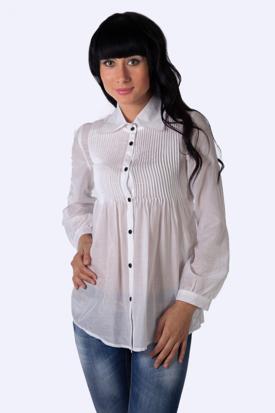 Легкая блузка разнообразит Ваш гардероб и позволит Вам выглядеть великолепно! Тонкий поясок под грудью позволит скрыть все недостатки фигуры и подчеркнуть зону декольте. Из-за игривой плиссировки рубашка не кажется скучной, а рукава с подворотом выгодно представят Ваши тонкие кисти.