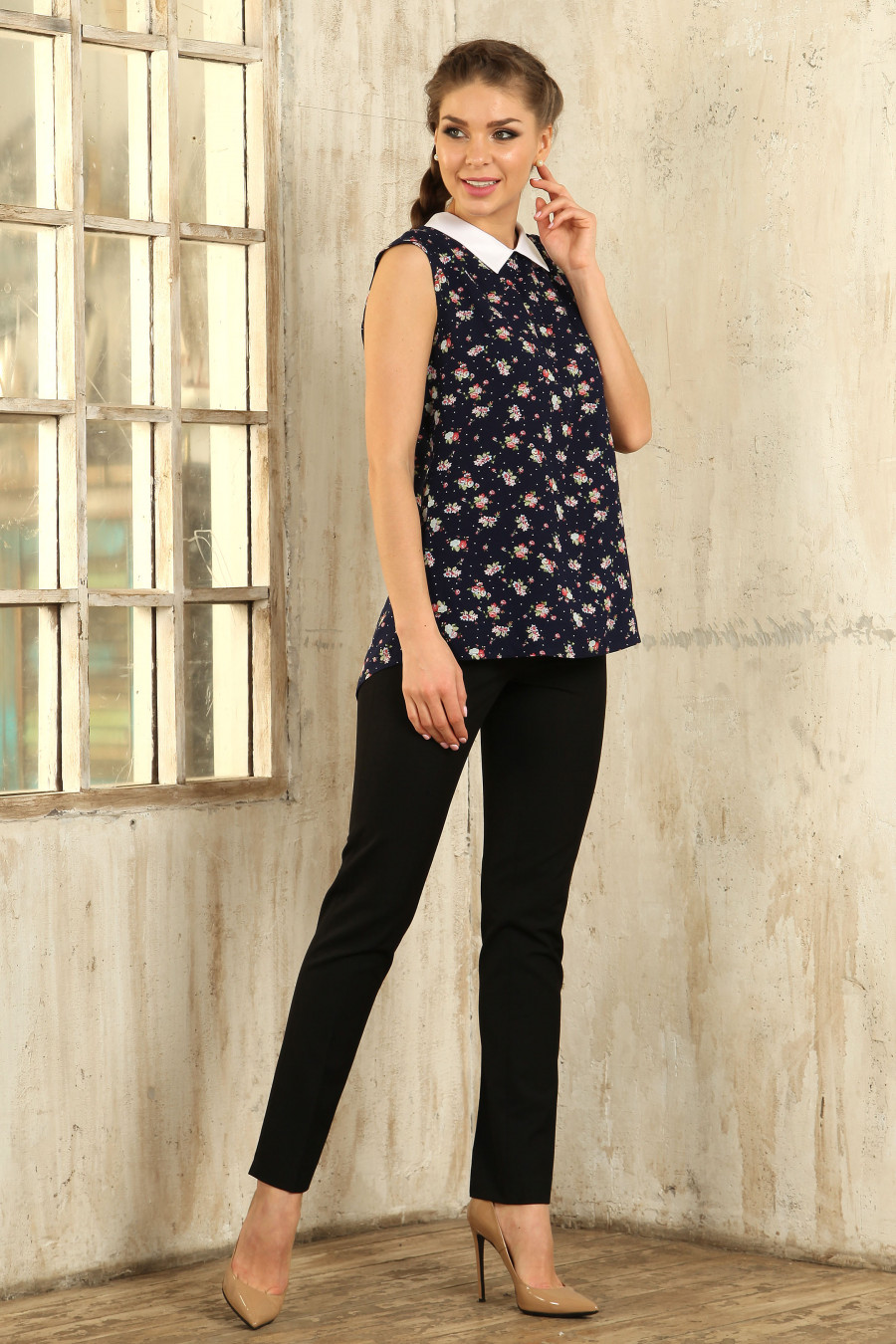 Блуза на пуговицах без рукавов, с цветочным орнаментом.