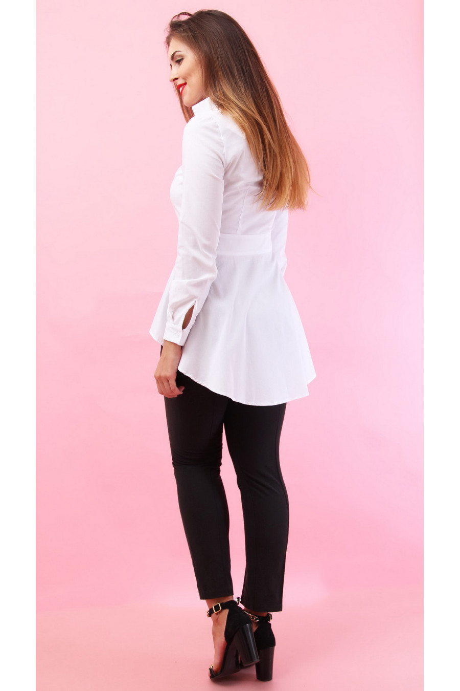 Хлопковая блузка оригинального кроя, сильно приталенный силуэт, воротник сложная стойка, втачной пояс и ассиметричная баска придает фигуре утонченность и солидность