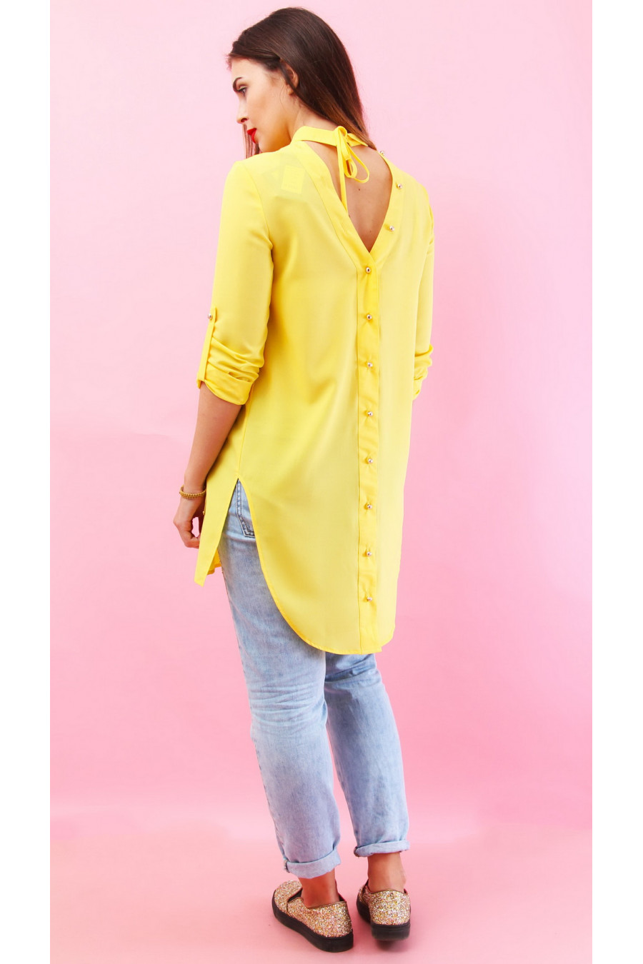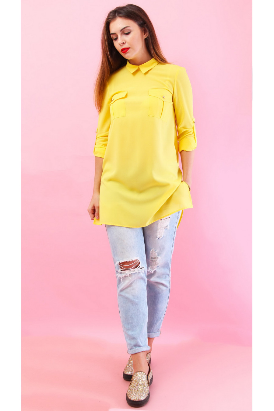 Туника свободного силуэта, ассиметричный крой подола, длинный рукав застегивающийся на пату, на круди накладной кармашек сафари, рубашечный воротник. Изюменку модели придает застежка сзади на золотые пуговки и декольте по спинке.